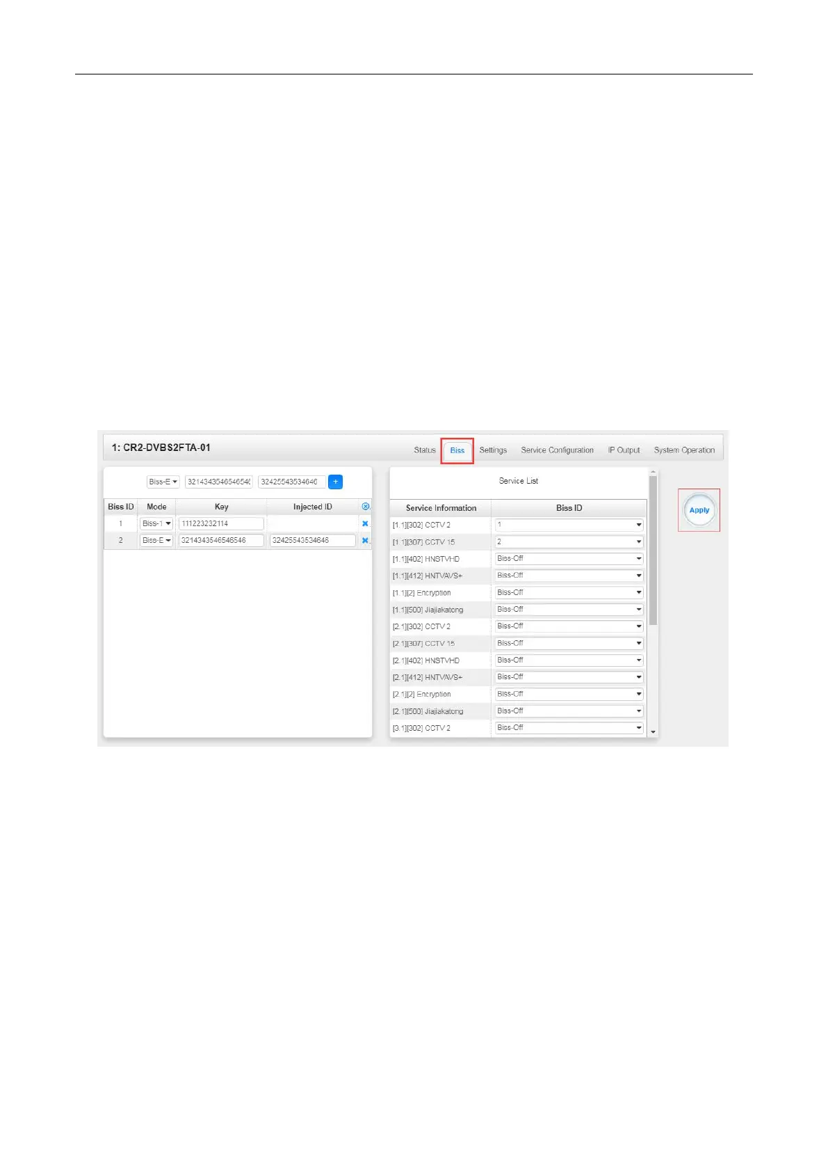 Here you can create Biss ID, including Mode, Key and Injected ID. And you can check the Service