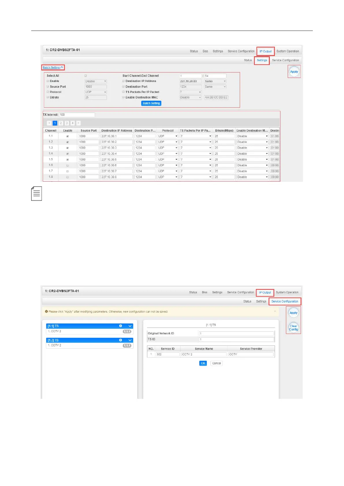 IP Output > Service Configuration> Users can make configuration for output services .