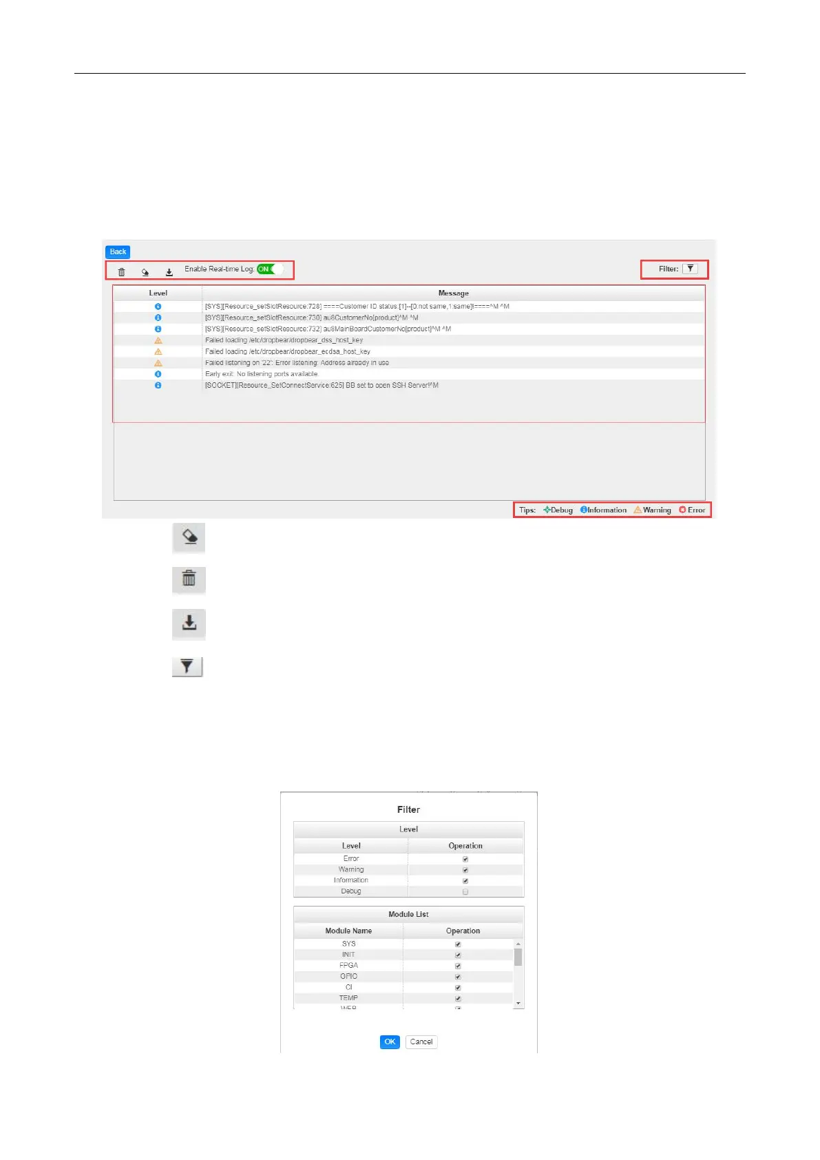 Log Manage> This page shows the logs of the module. If there are issues encountered on this