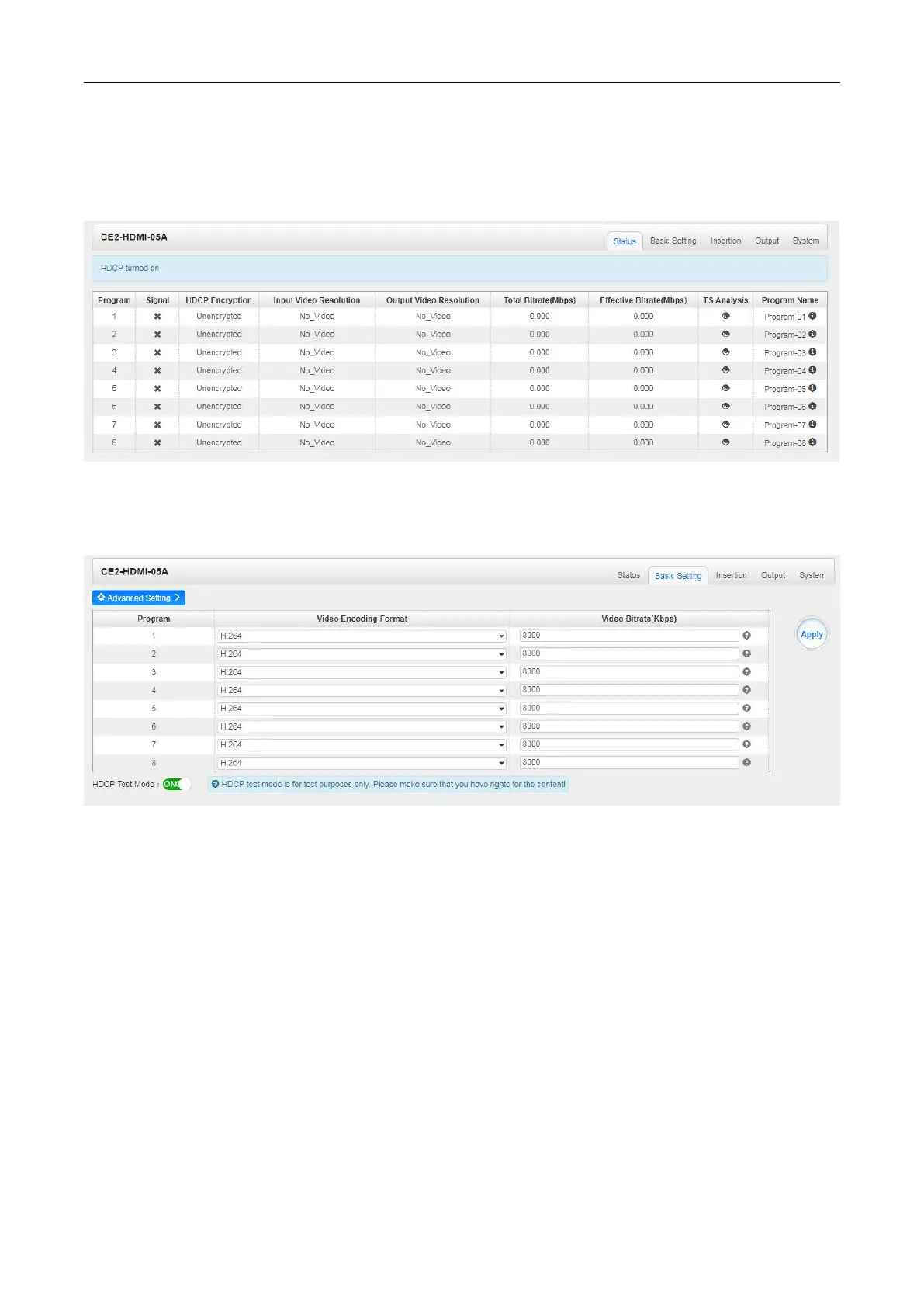 Wellav CMP201D - CE2-HDMI-05 A Status; CE2-HDMI-05 A Basic Settings