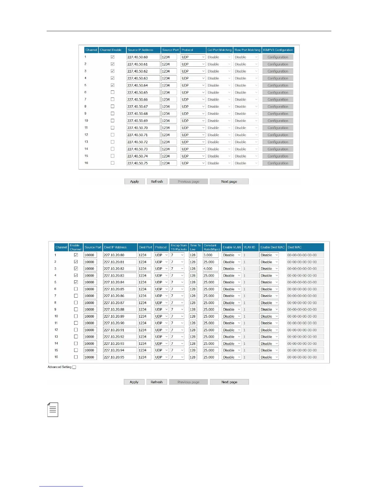Enable output TS channel. Configure multicast destination IP address, source port, and protocol.