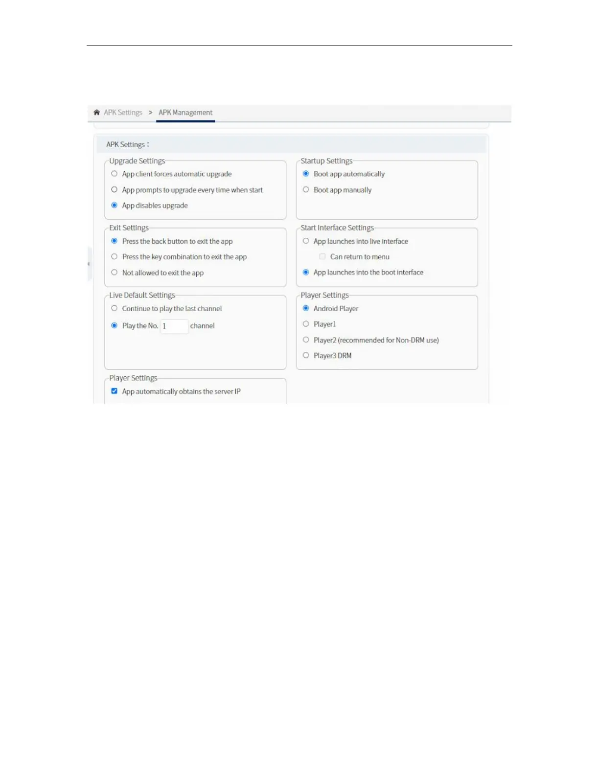 regarding on Upgrade, Startup, Exit, Start Interface, Live Default, and Player Settings.