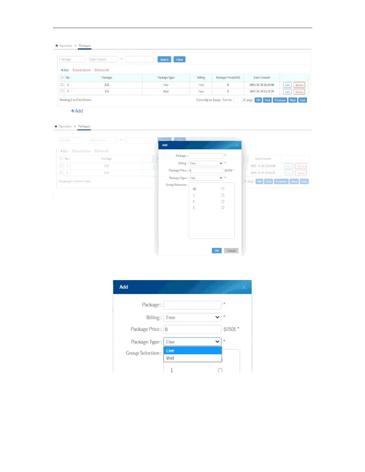 You can choose between Live and VOD package. Select which one you want to make.