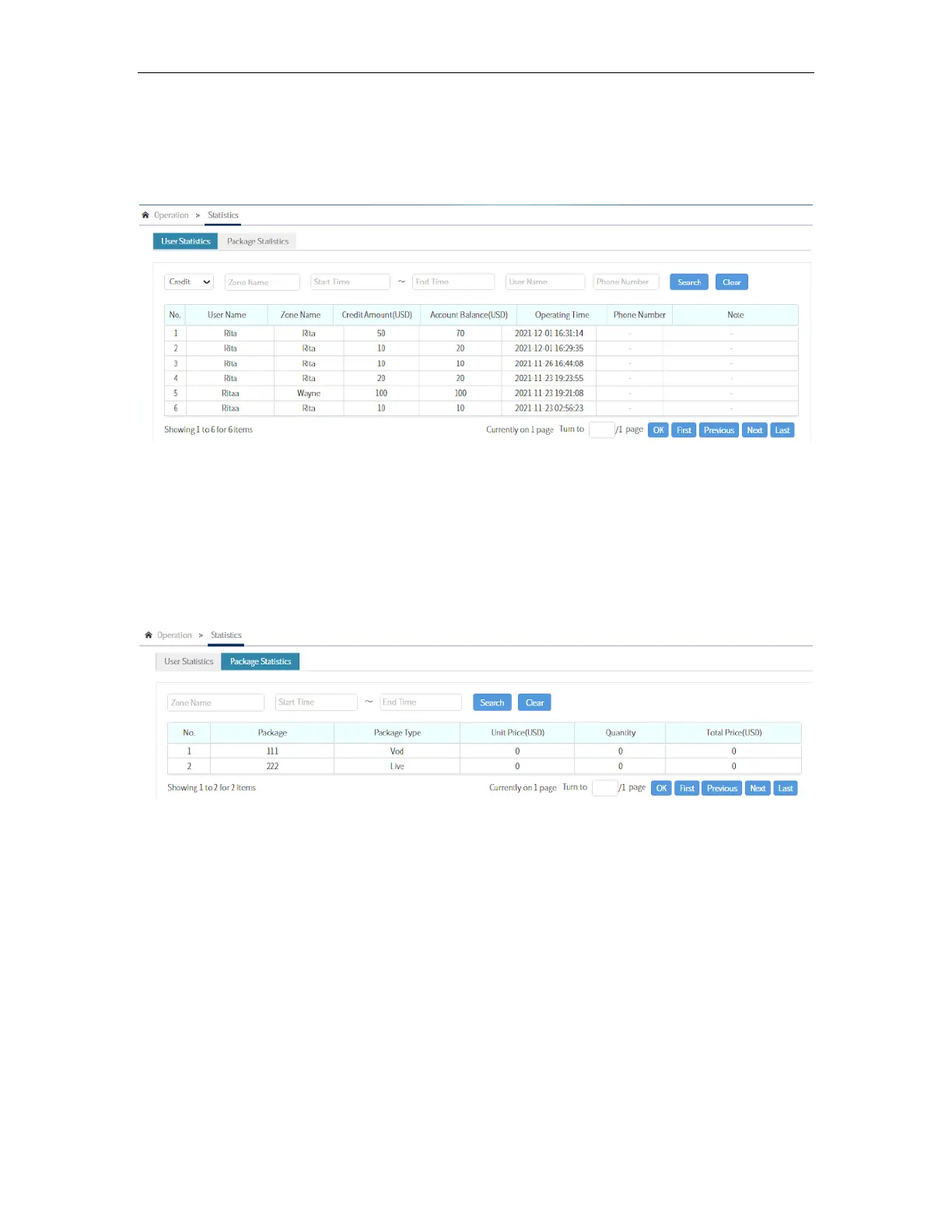 This submenu under the User Statistics displays the Credits and Balance of all the users.