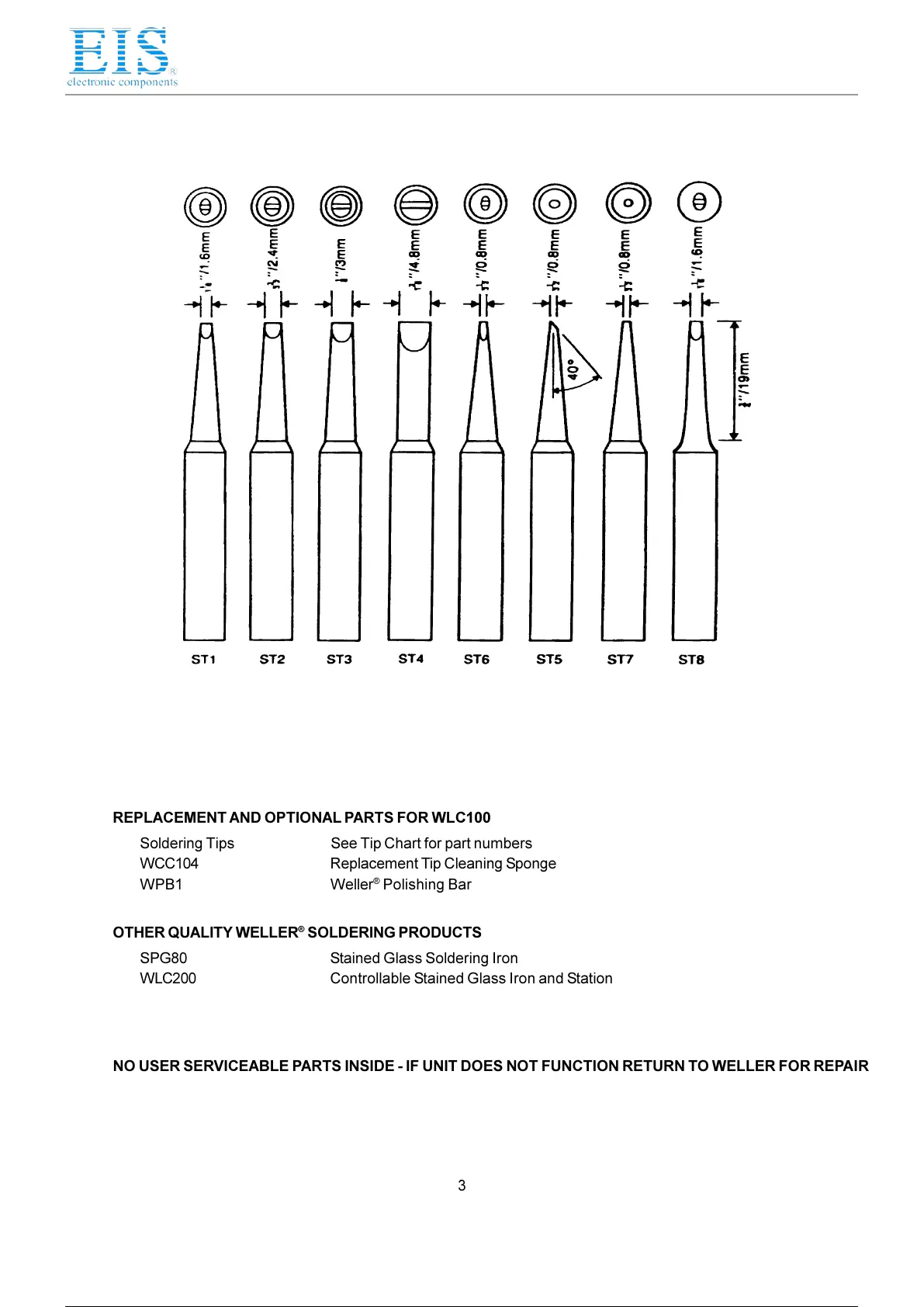 NO USER SERVICEABLE PARTS INSIDE - IF UNIT DOES NOT FUNCTION RETURN TO WELLER FOR REPAIR