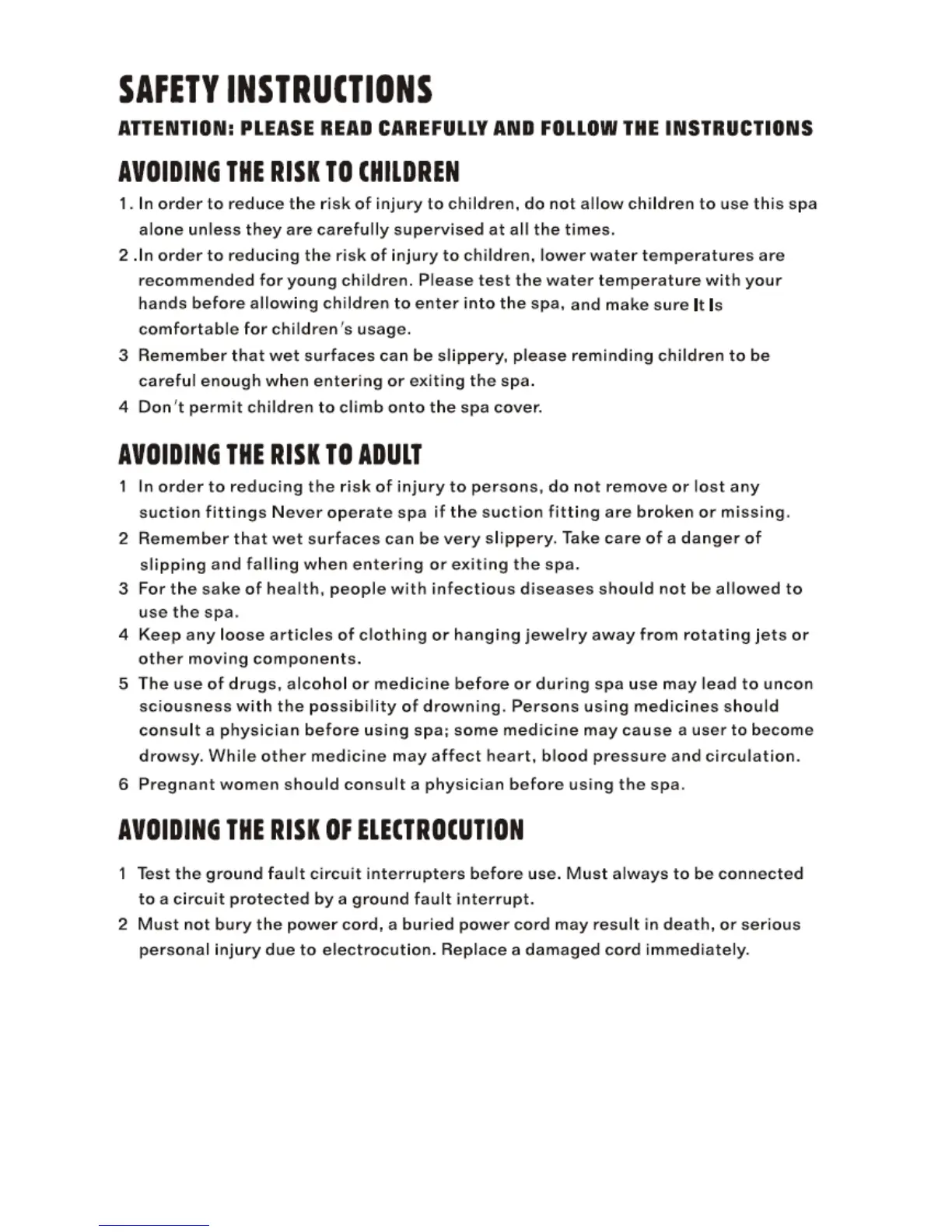 Wellis SAMOA - SAFETY INSTRUCTIONS; AVOIDING THE RISK TO CHILDREN; AVOIDING THE RISK TO ADULT; AVOIDING THE RISK OF ELECTROCUTION