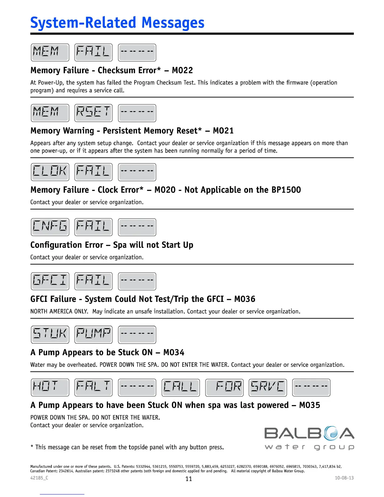 Wellis Venus - System and Pump Error Messages; Memory, Configuration, and GFCI Errors; Pump Stuck ON;Last Powered Errors