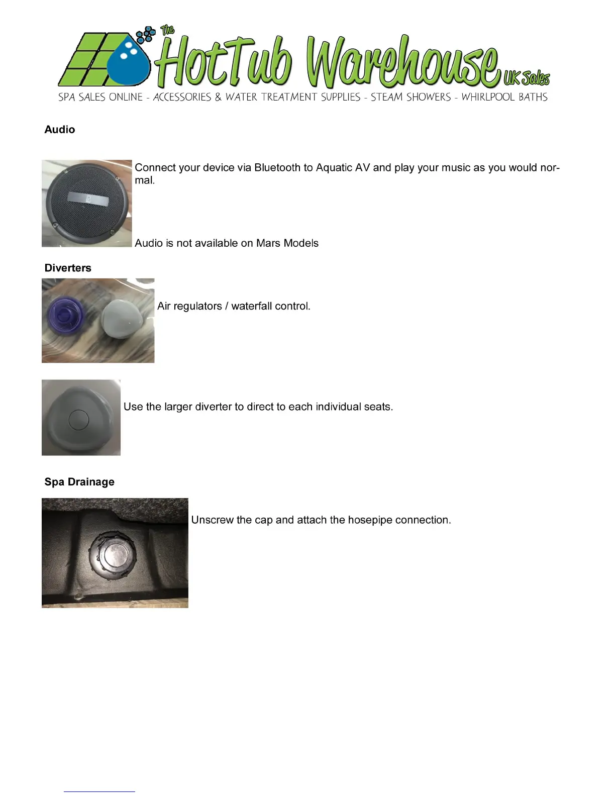 Wellis Venus - Spa Features and Operation; Audio System Connectivity; Diverter Valve Functionality; Spa Drainage Procedure