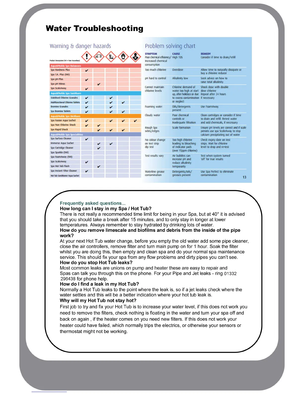 Wellis Venus - Troubleshooting Water Issues; Water Problem Solving Chart; Common User Questions