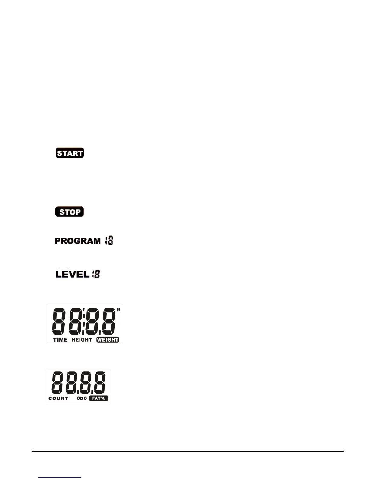 F. MODE: Changes the display of the values between CALORIES or WATT. The values of