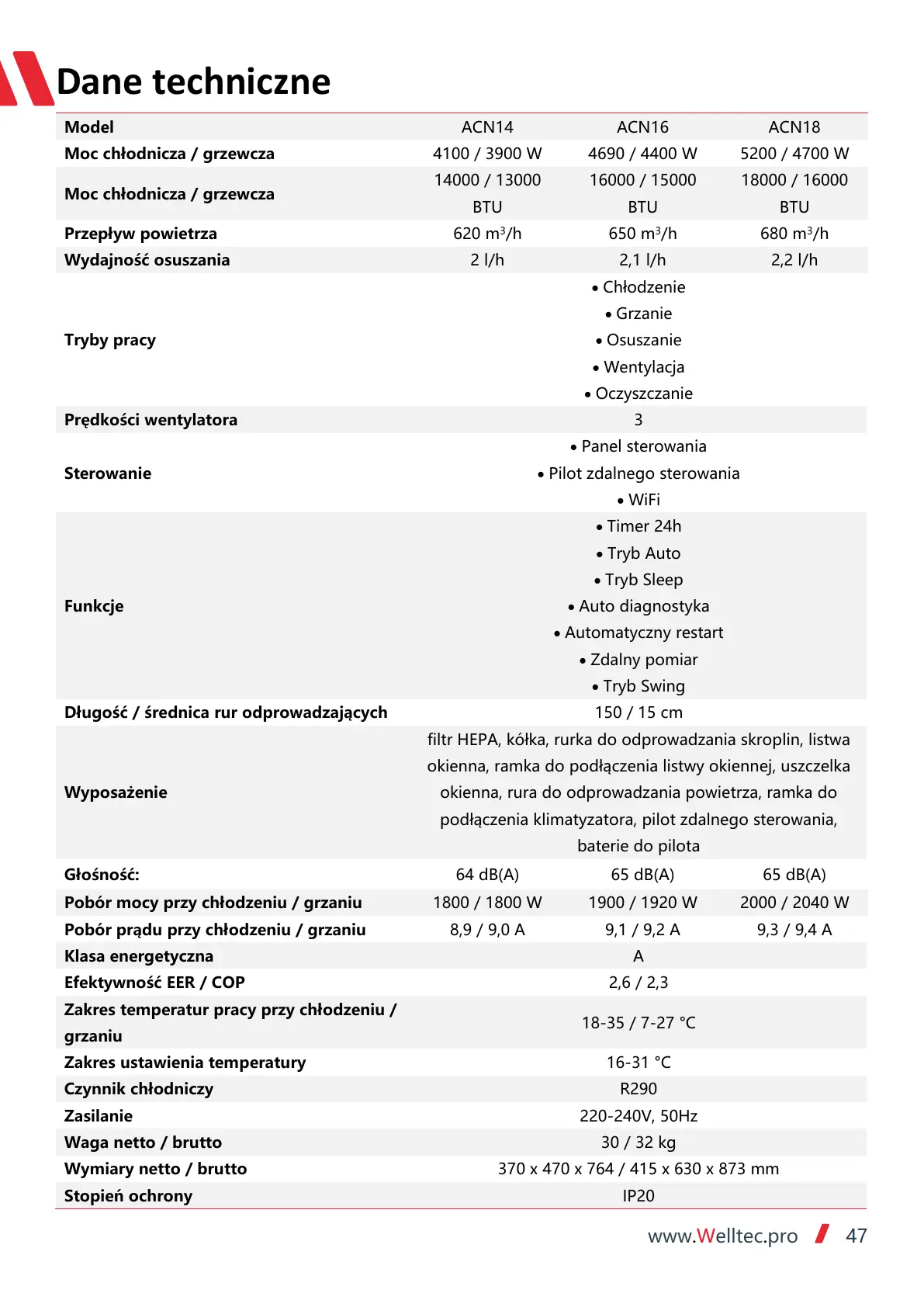 Pobór mocy przy chłodzeniu / grzaniu 1800 / 1800 W 1900 / 1920 W 2000 / 2040 W