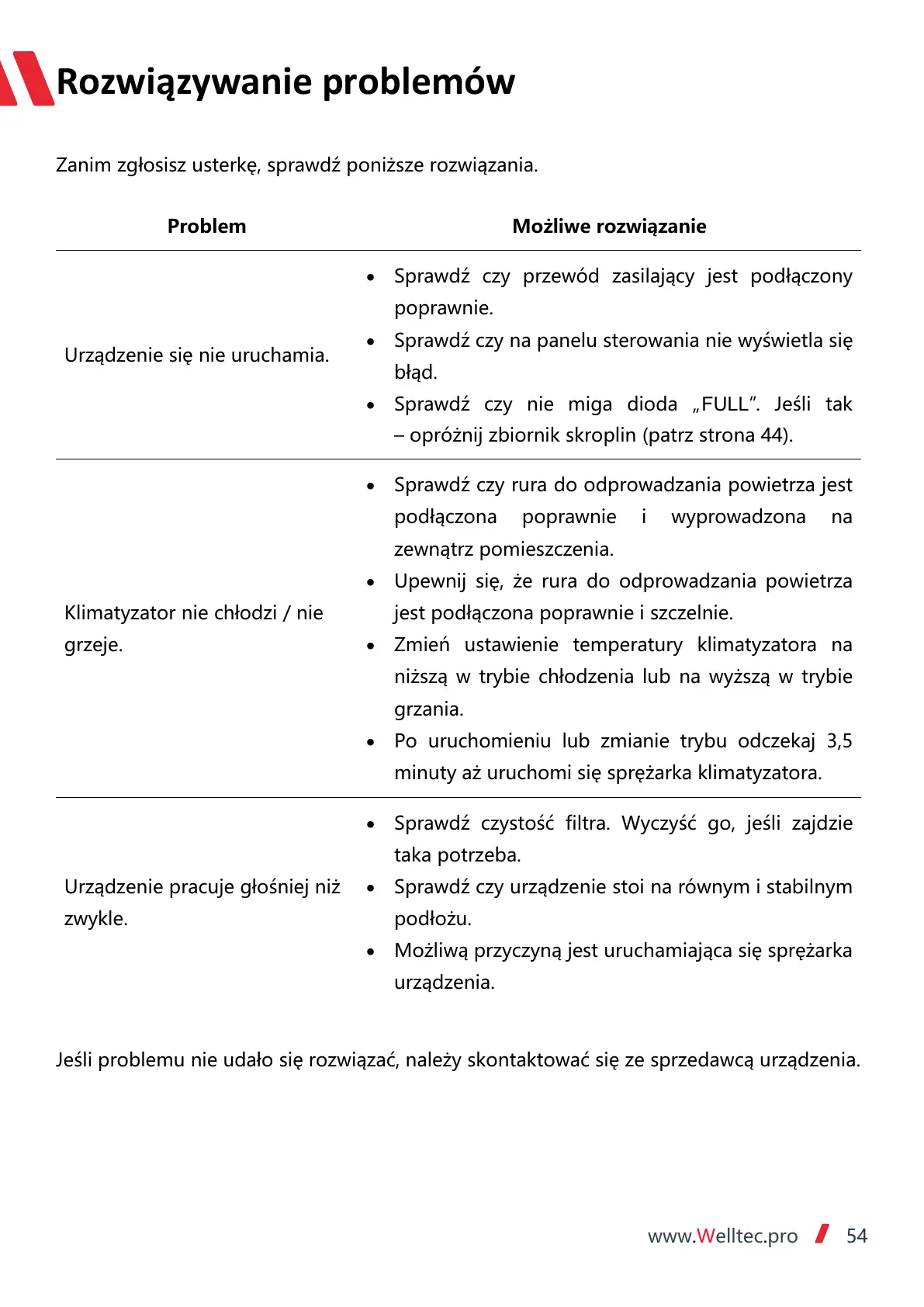 Jeśli problemu nie udało się rozwiązać, należy skontaktować się ze sprzedawcą urządzenia.