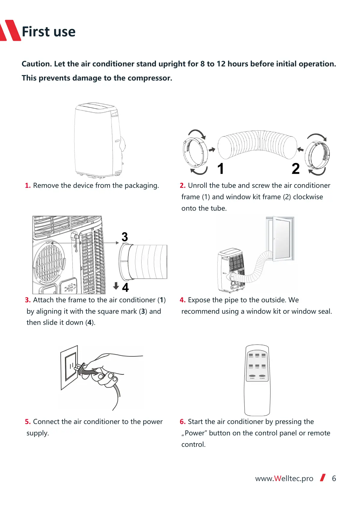 Caution. Let the air conditioner stand upright for 8 to 12 hours before initial operation.