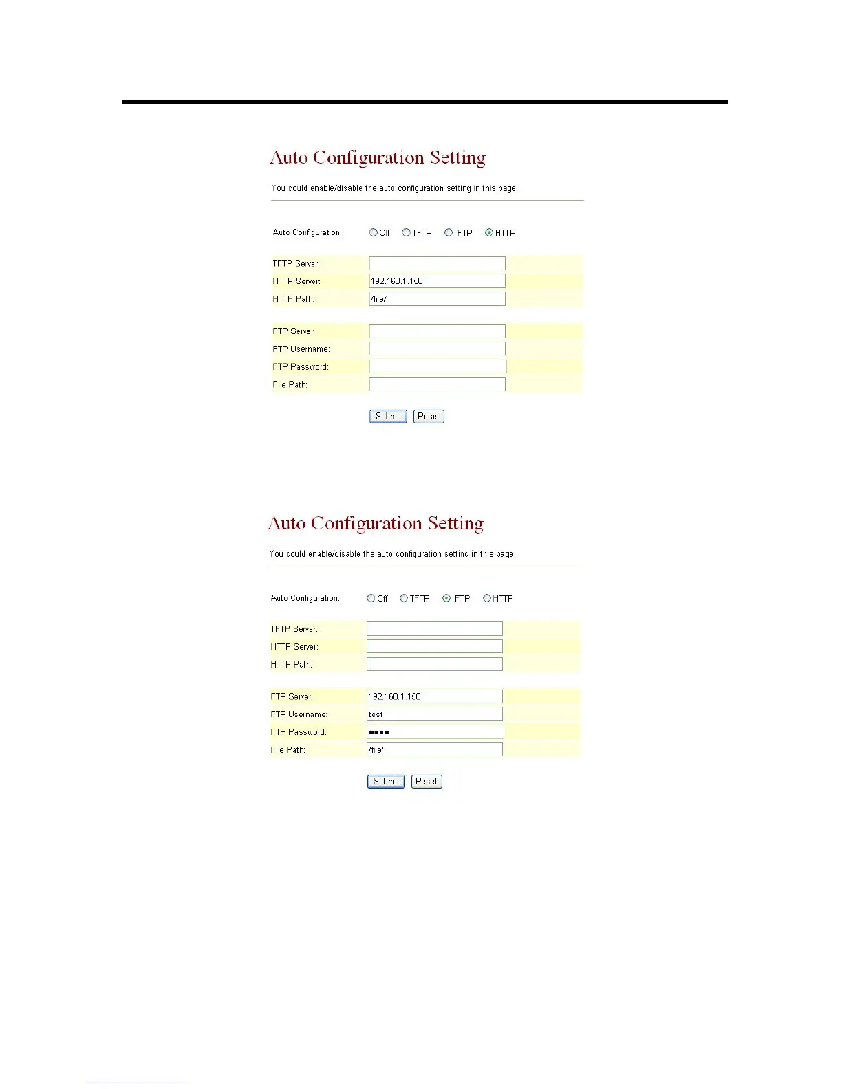 Example 1: Auto Configuration: HTTP,HTTP Server: 192.168.1.50,HTTP Path: /file/。