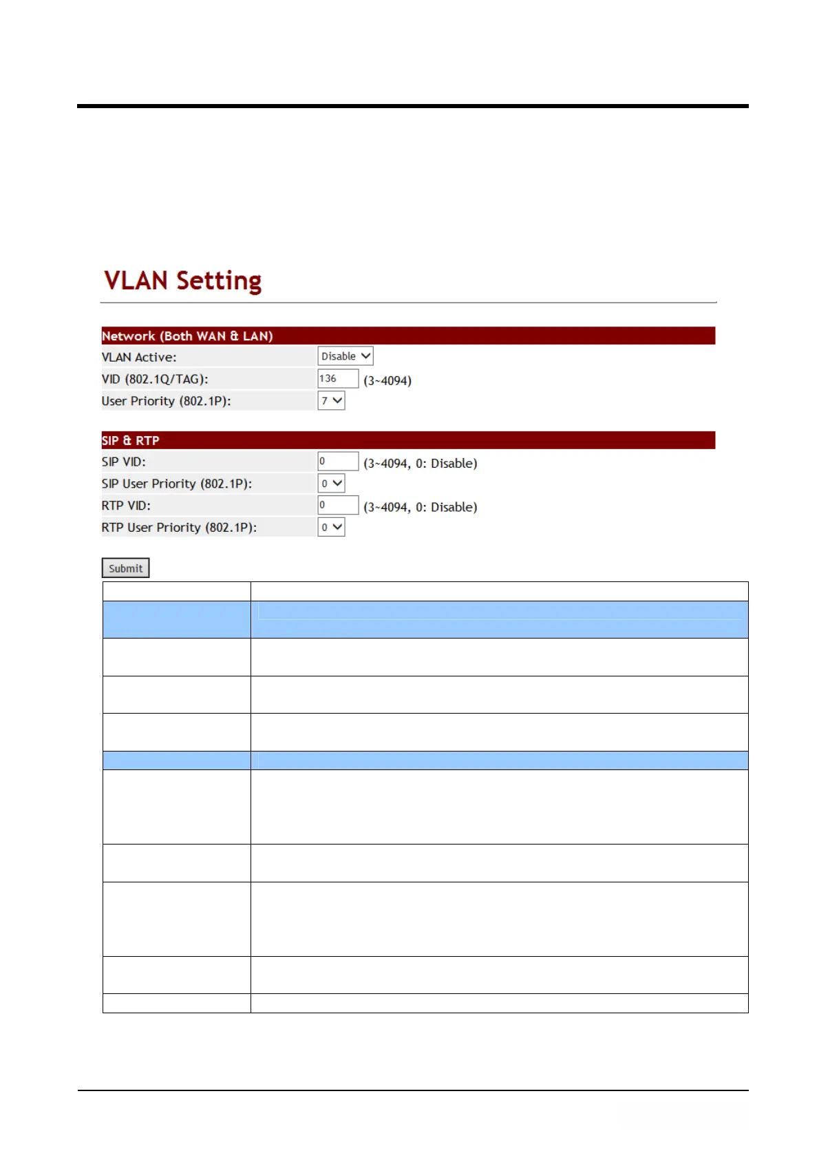 RTP VID Default is 0 (disable). Define SIP VLAN ID. Range is 3~4094.