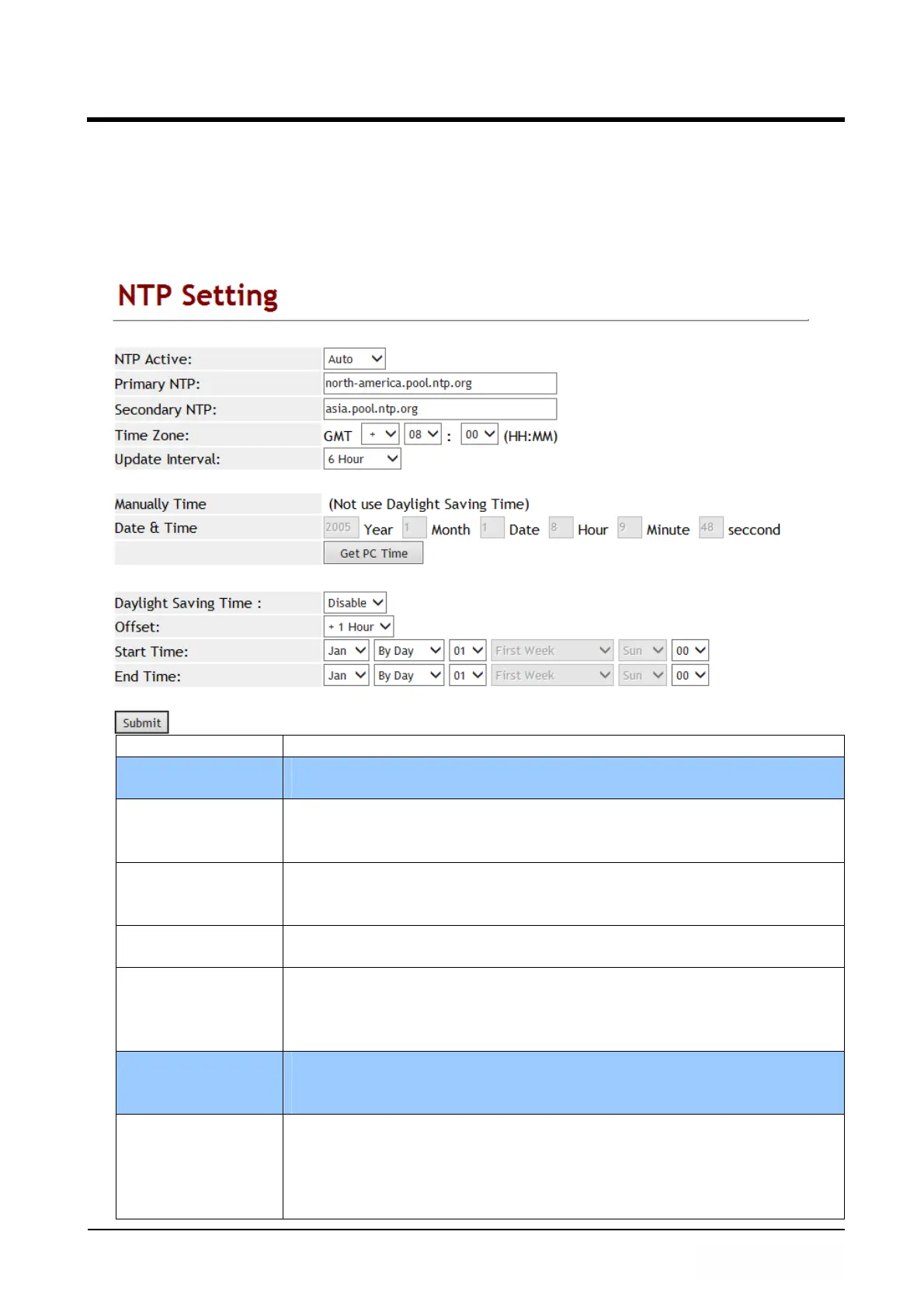 NTP Active Default: Enable; When Enable this function, the SNTP is on.