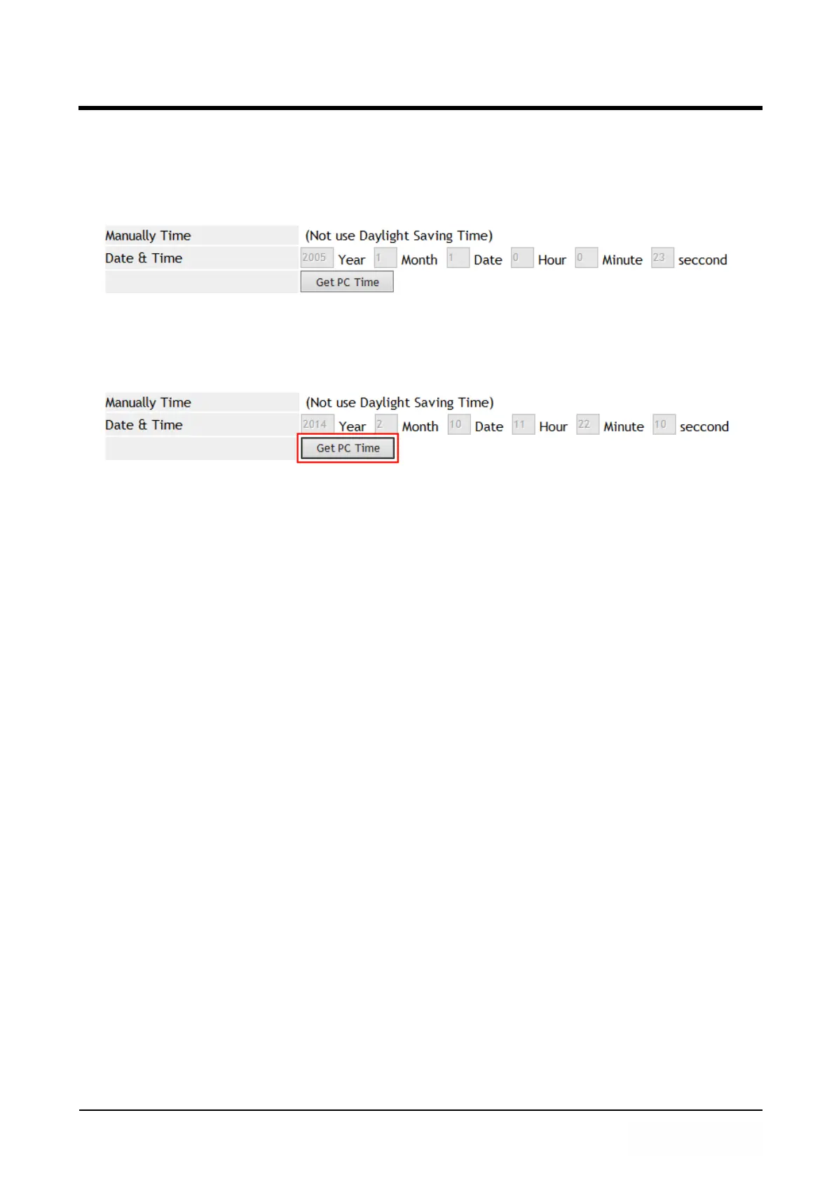 Step 1: In [NTP Setting] web page, Setup [NTP Active: Manual] , Press [Get PC Time]