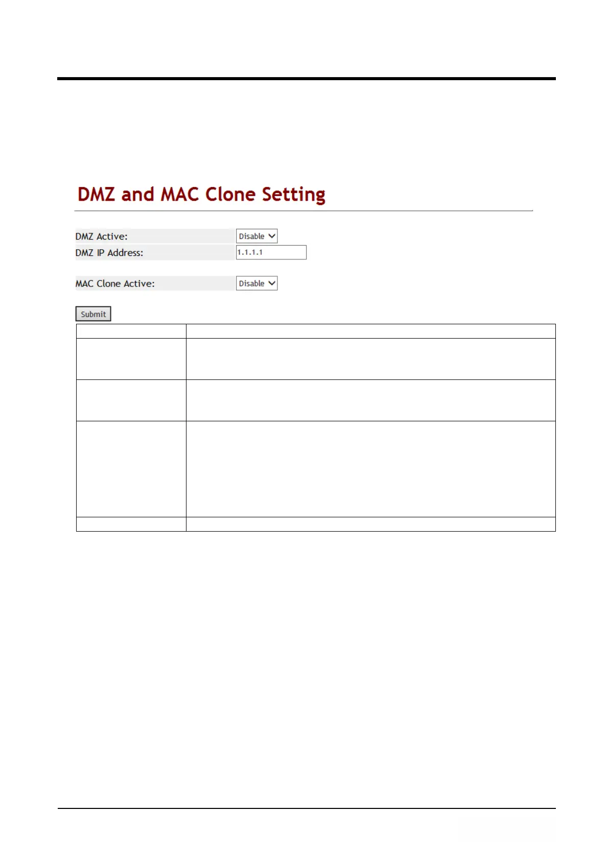 Provide DMZ and MAC Clone configuration.