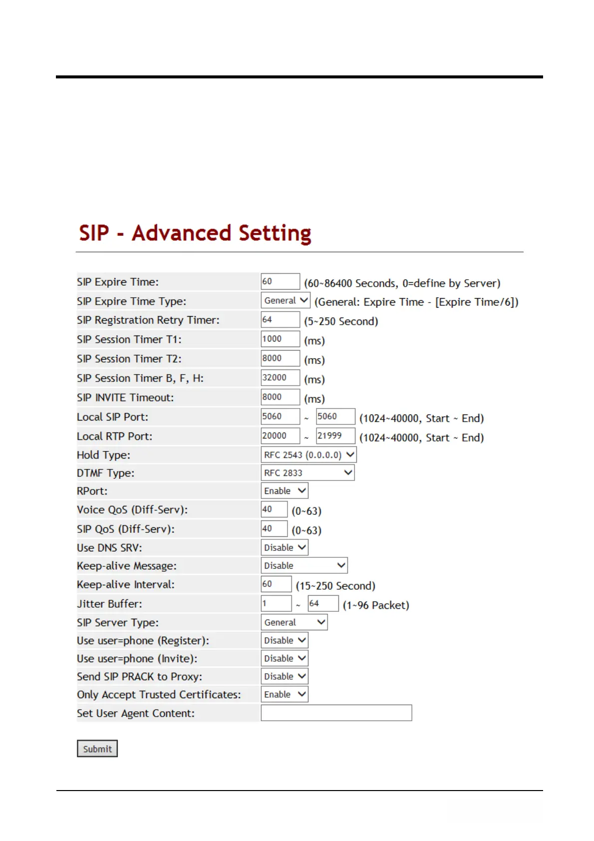 Provide [SIP Expire Time, SIP/RTP Port, QoS, Register SIP Expire Time, Use DNS SRV,