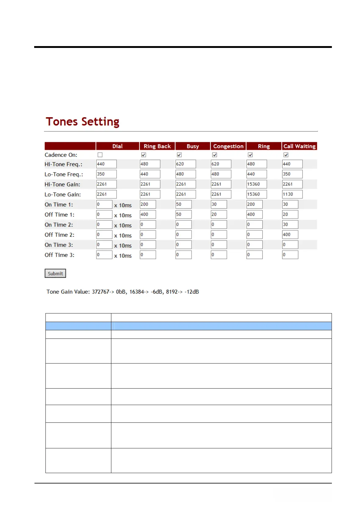 Tone setting provides Dial, Ring Back, Busy, Congestion, Ring, Call Waiting Tone and