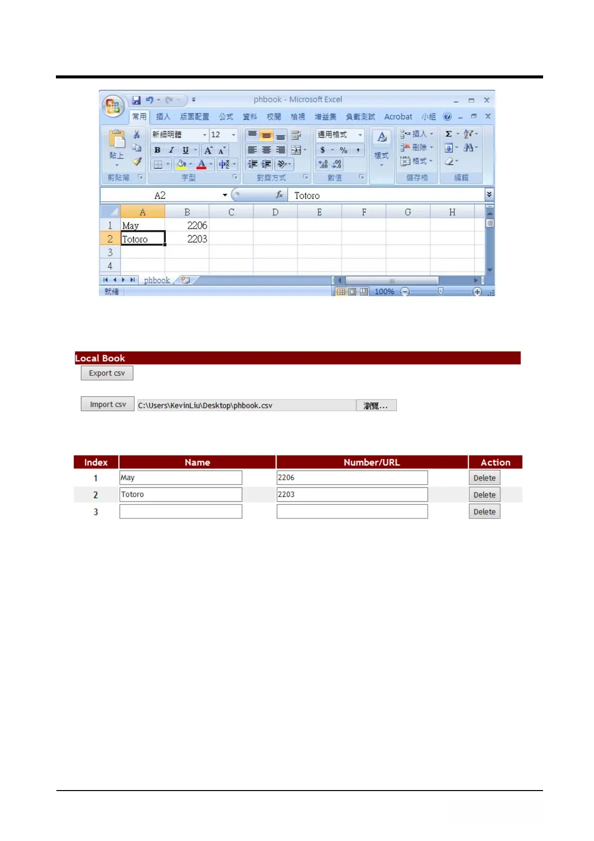 [example: F:\Test\phbook.csv], press [Import csv)] button (See Figure 7).