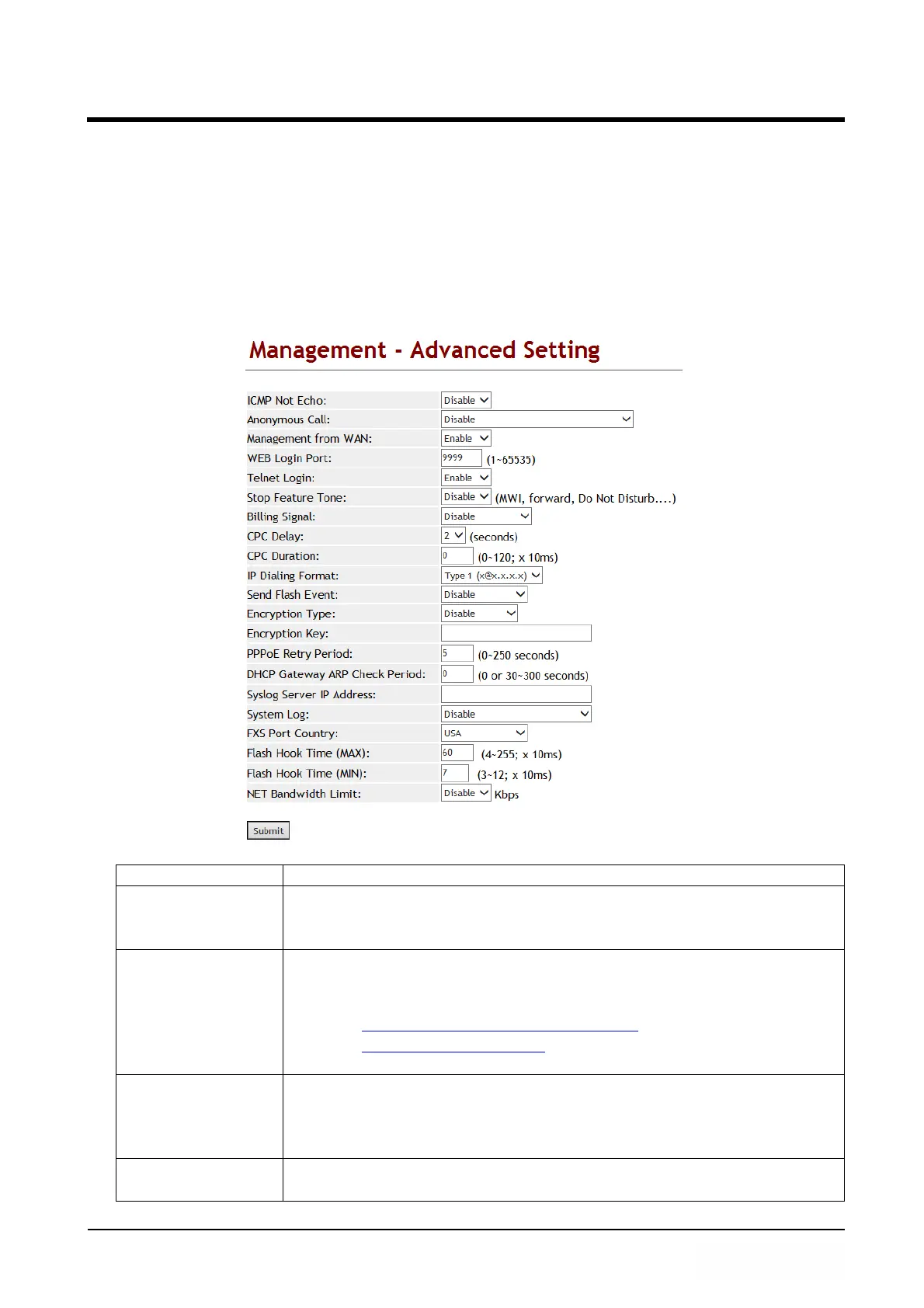 Provide anonymous call, billing signal, encryption, syslog and FXS/FXO parameter