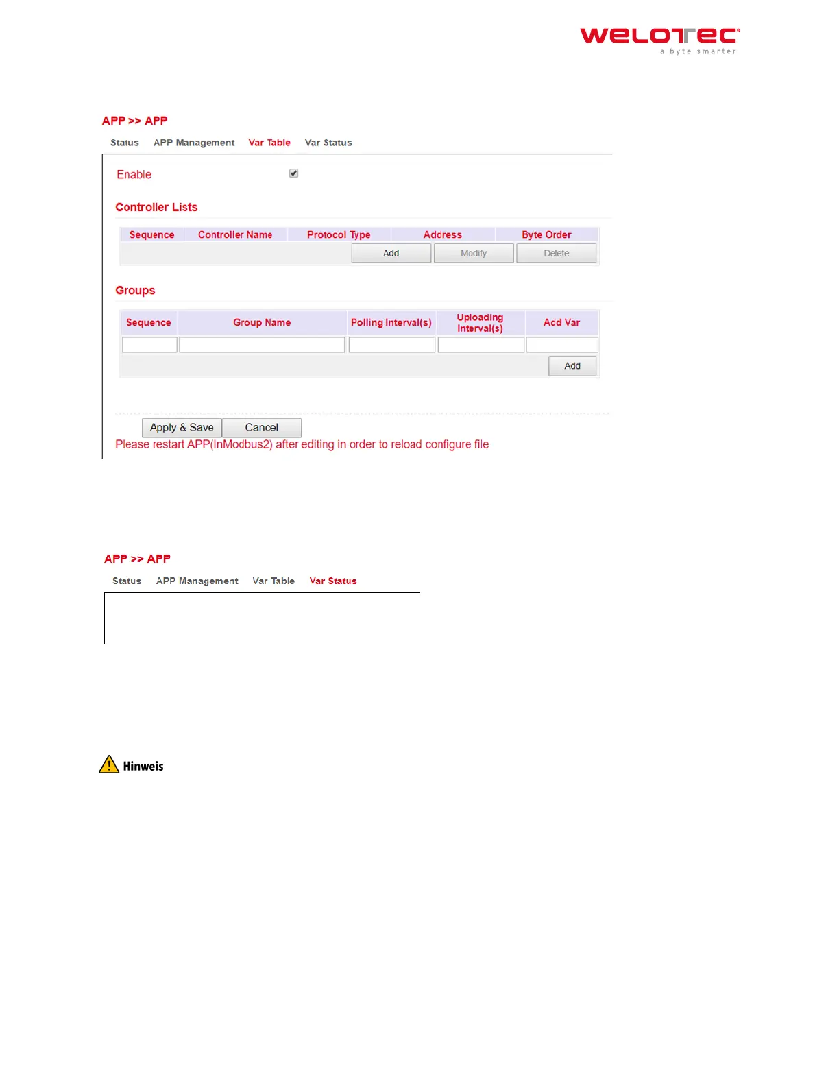 If you use your own APPs for the access to Modbus, you have the possibility to display the status here. At the