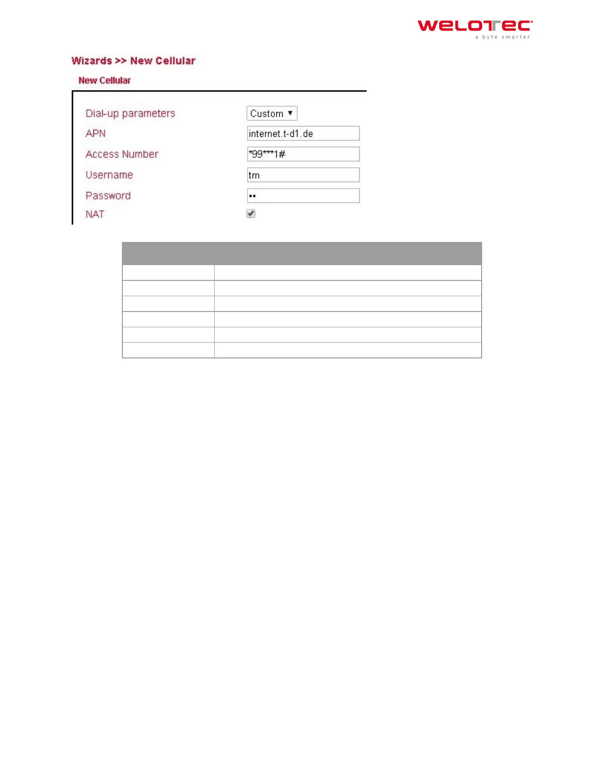 Password Password for the user name to the above APN, if it is necessary