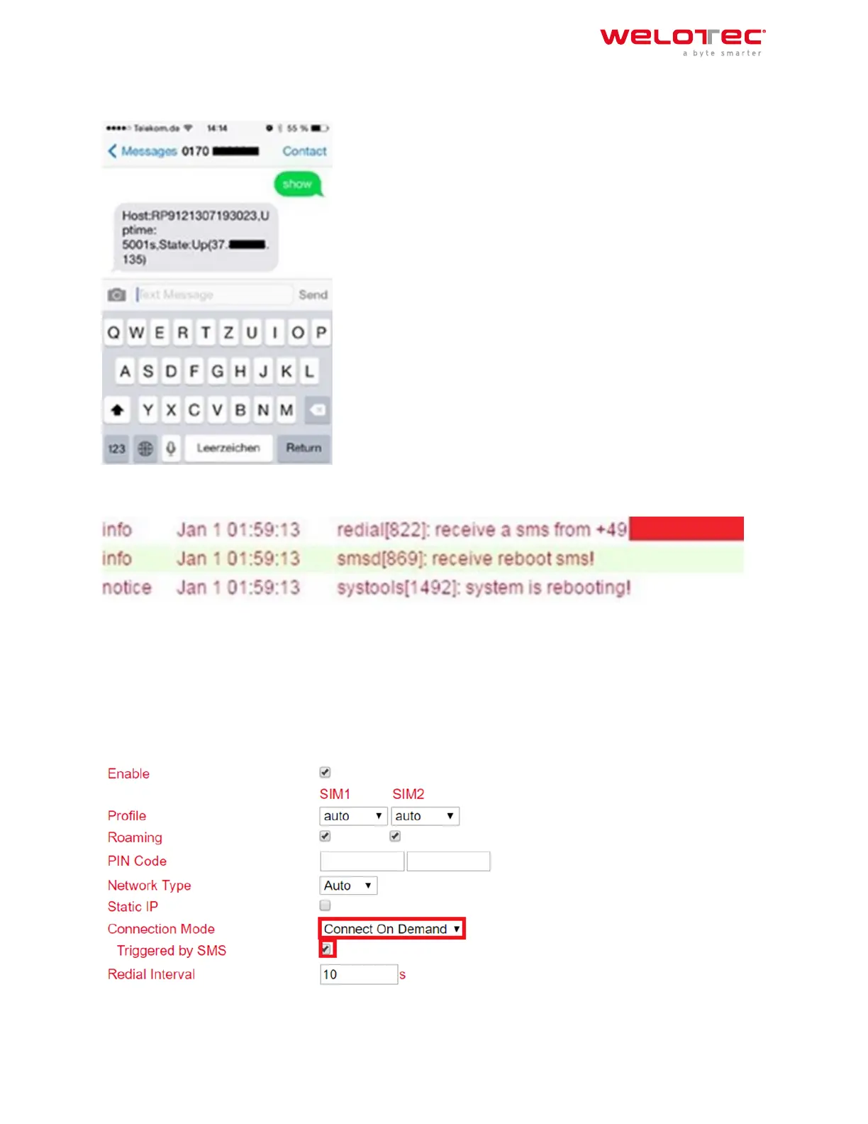 If now an SMS with the content show is sent to the mobile phone number of the router, the router sends its