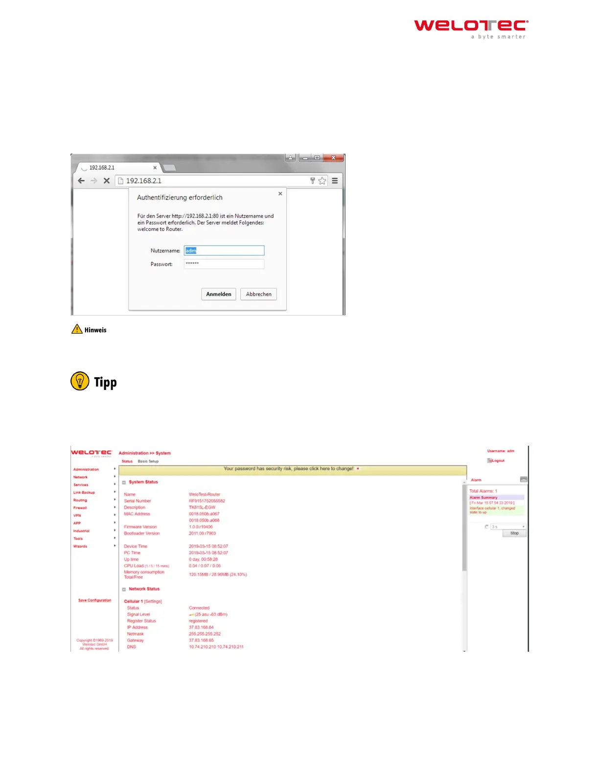 the user name (default: adm) and password (default: 123456) and confirm with Login.