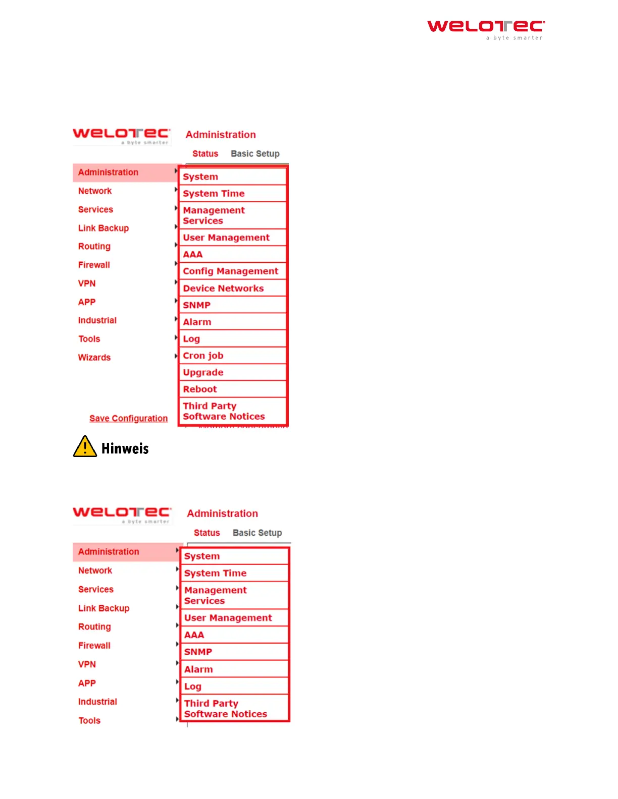 On the le side you will find the menu item Administration. Touching it with the mouse opens a submenu. In the