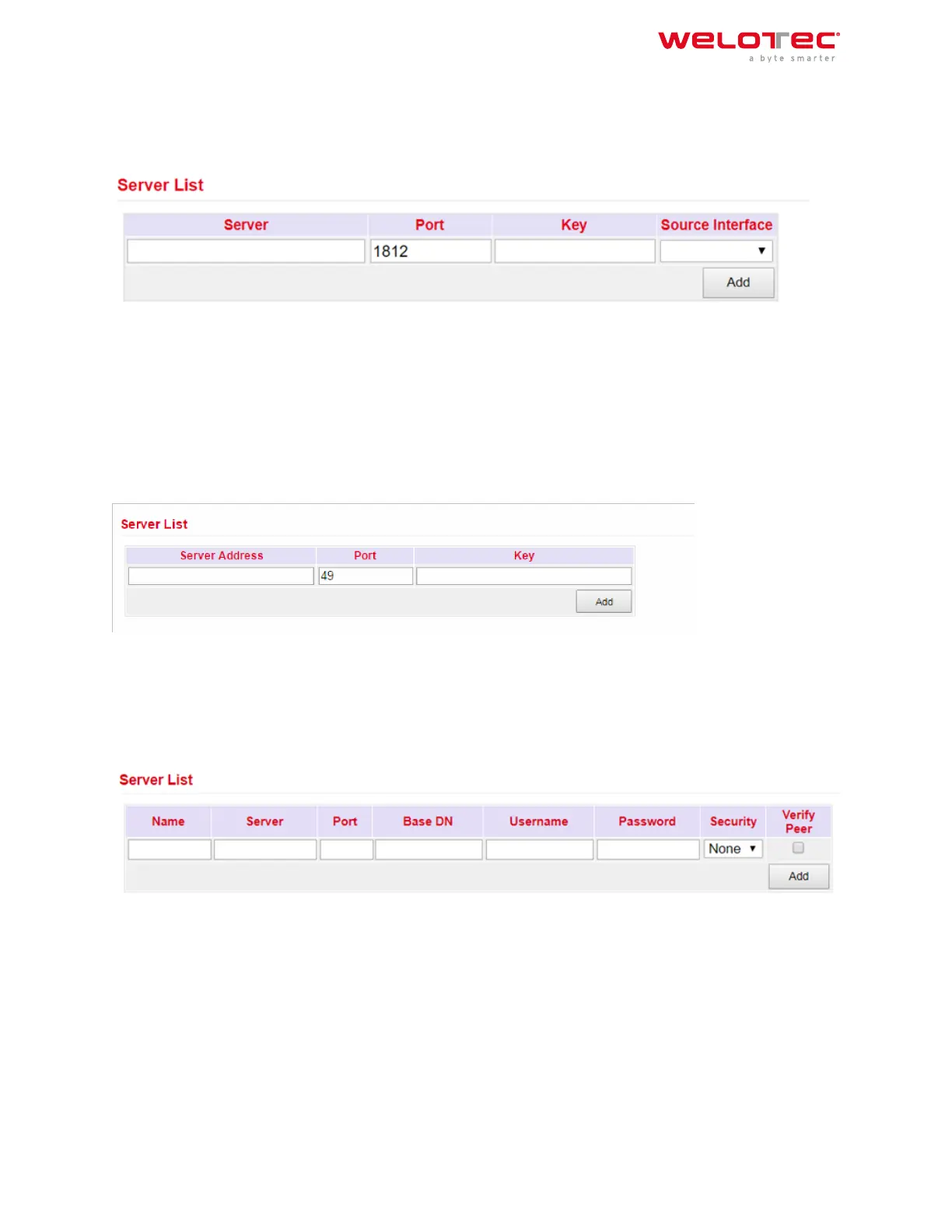 You can enter the FQDN or IP address of the server, the port, the key for the Radius server and the source interface