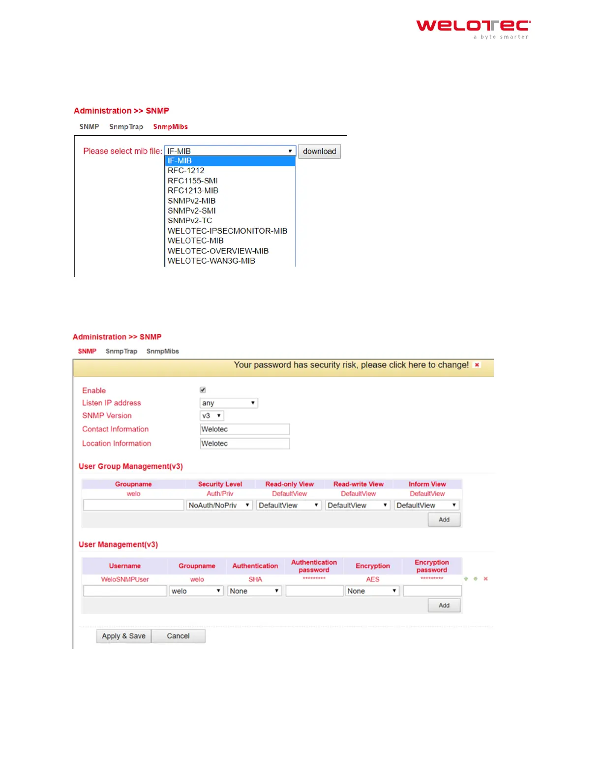 snmpwalk ‑v3 ‑u WeloSNMPUser ‑l AuthPriv ‑a SHA ‑A 123456789 ‑x AES ‑X 123456789 10.255.229.10