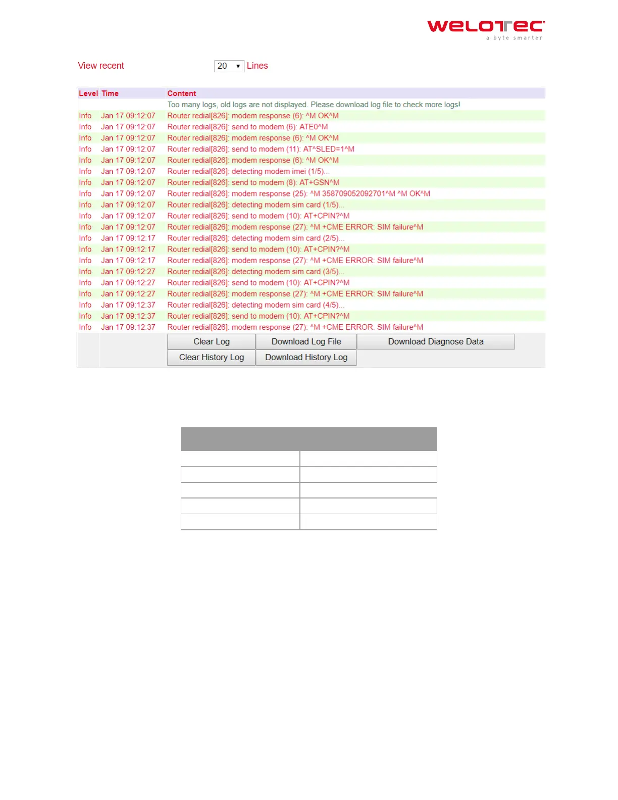 Under the log section there are options to clear the displayed logs, download the log, download the diagnostic file,