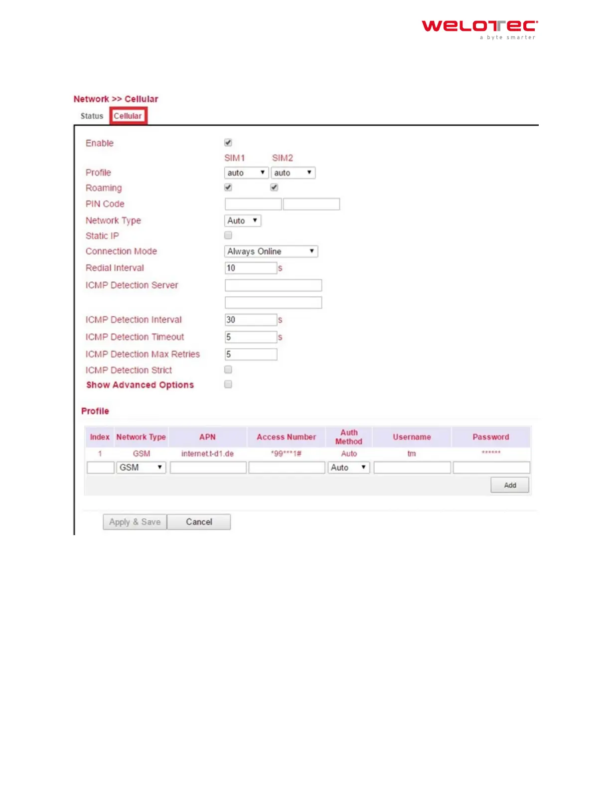 Under Network > Cellular > Cellular you can change access settings for the cellular network.