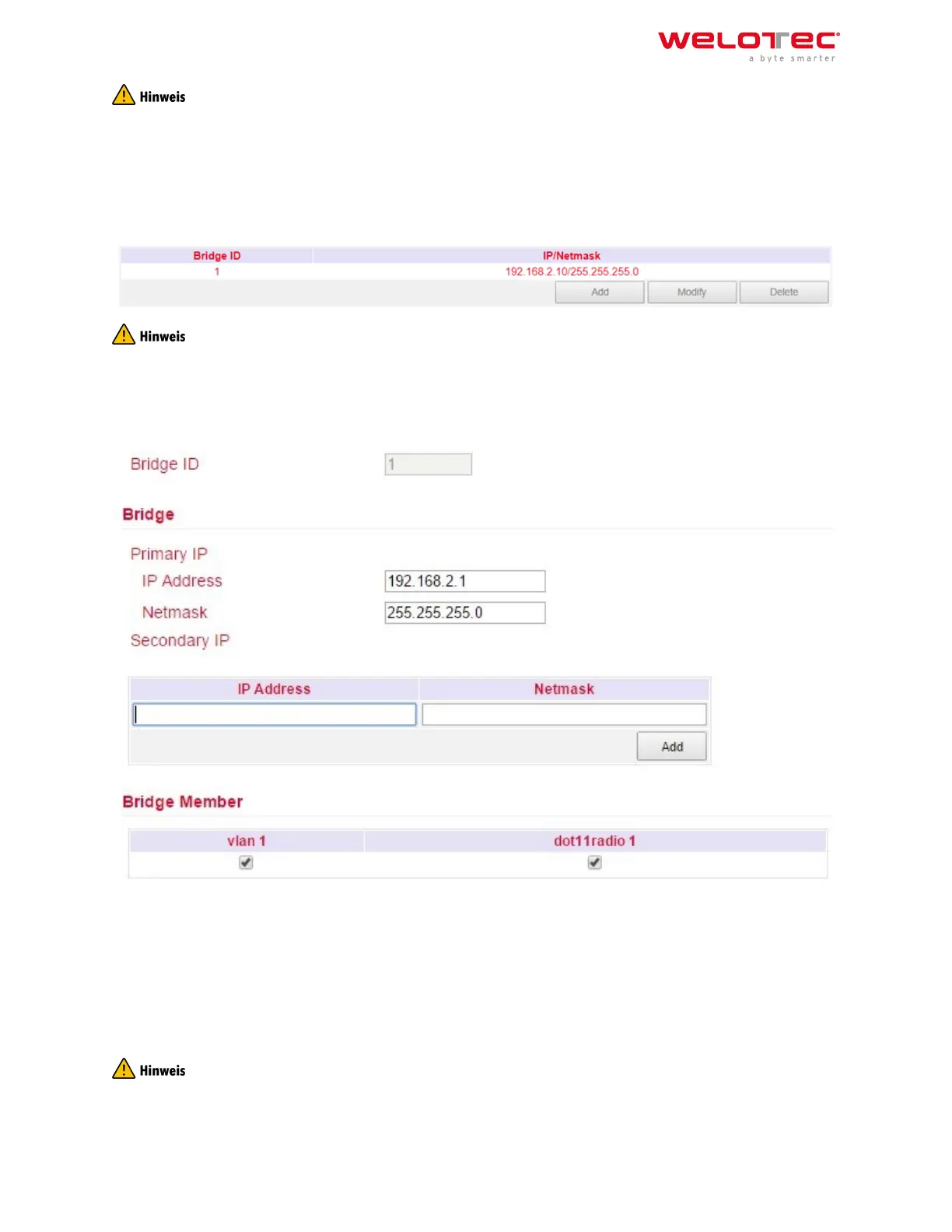 Here you can change the IP address of the bridge. Under Secondary IP you can assign additional IP addresses to
