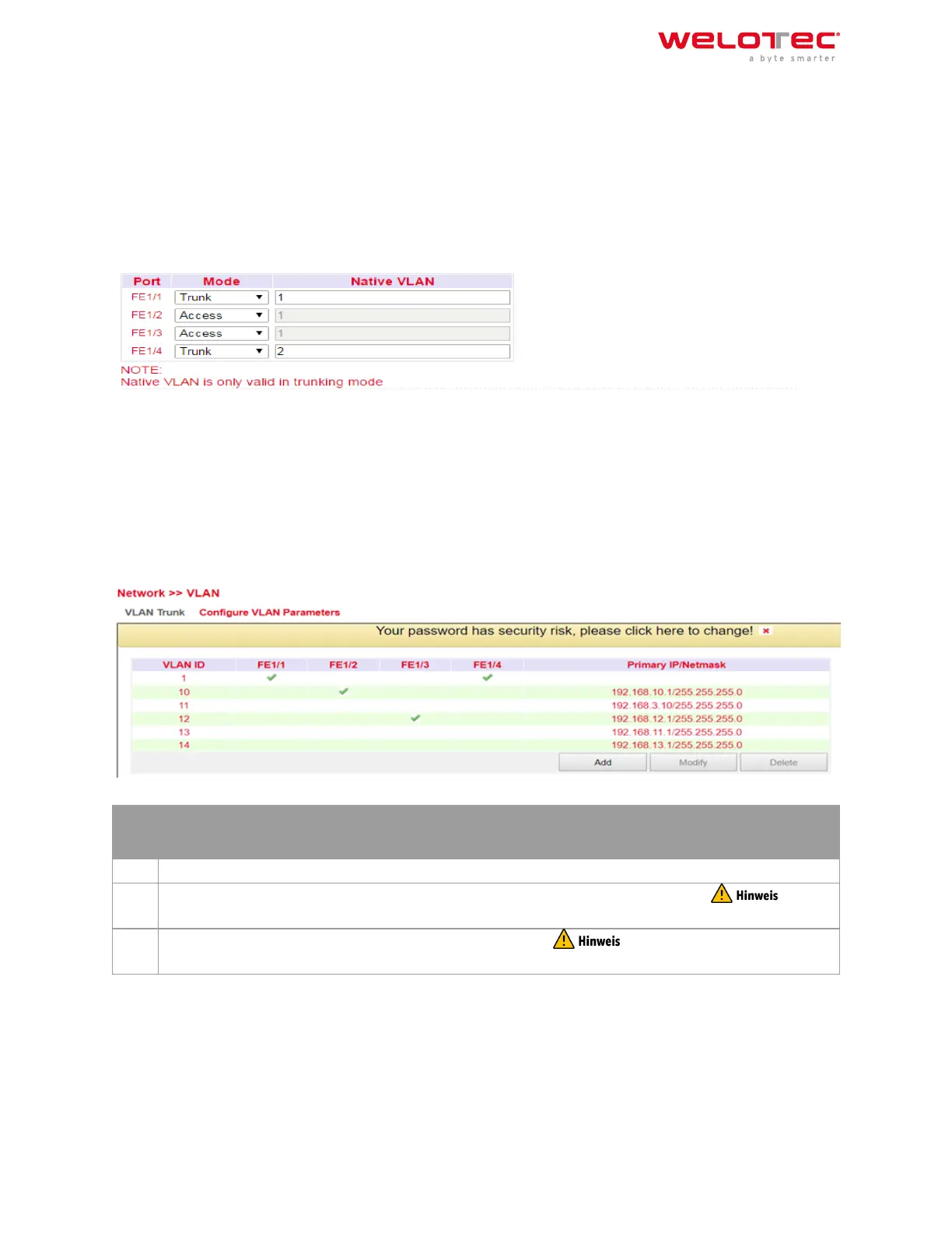 In the VLAN Trunk menu, dierent VLAN IDs can be assigned to the FastEthernet 1/1 to 1/4 network ports.