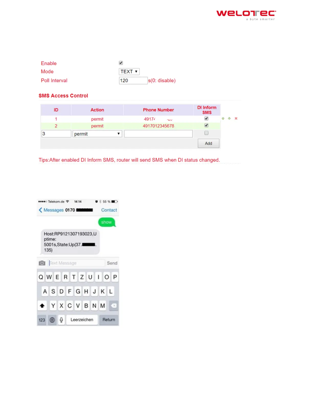 3. Enter in the table SMS Access Control the phone numbers which are allowed to send SMS to the router (format