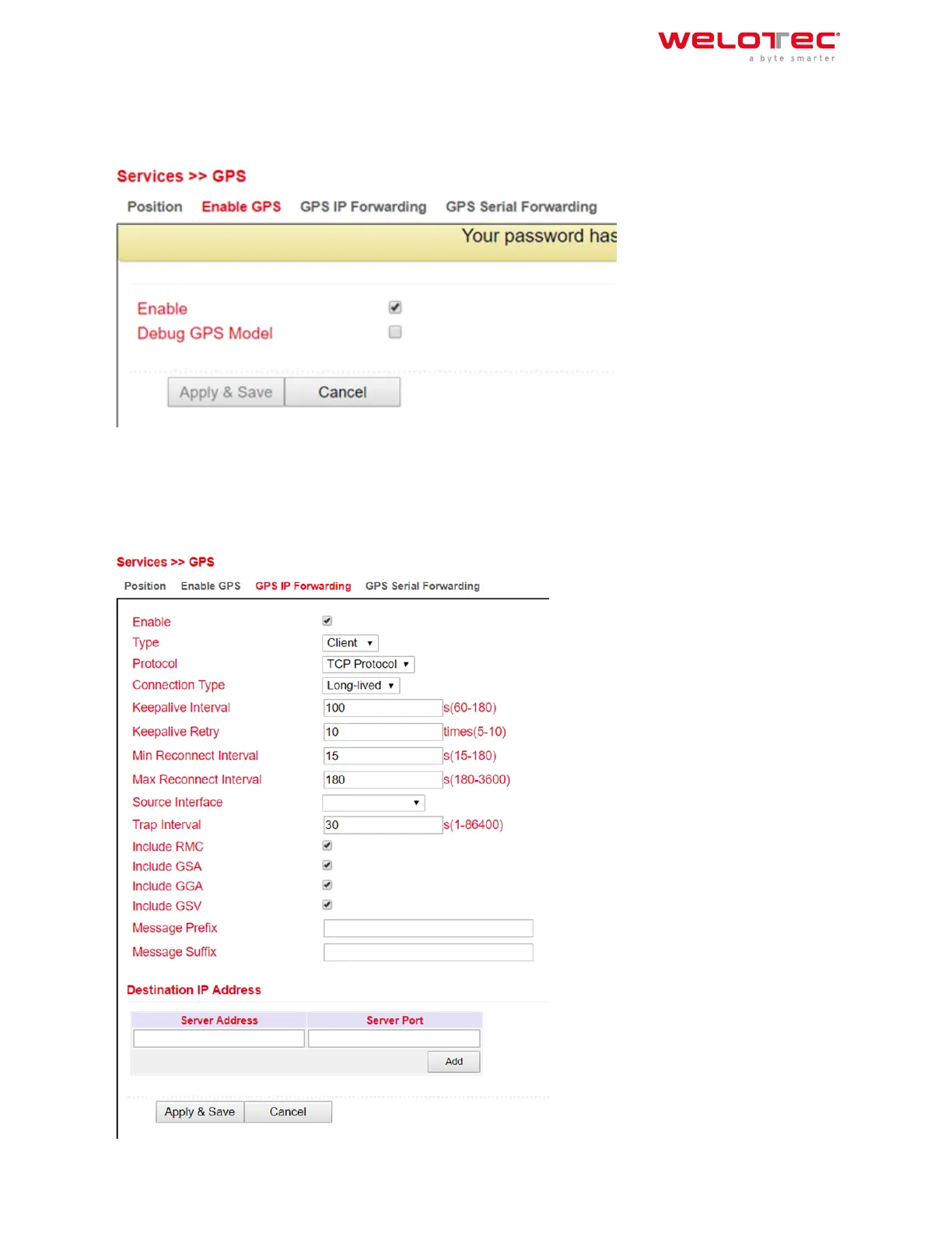Open the menu under Services > GPS > GPS IP Forwarding and click the Enable checkbox to turn on the function.