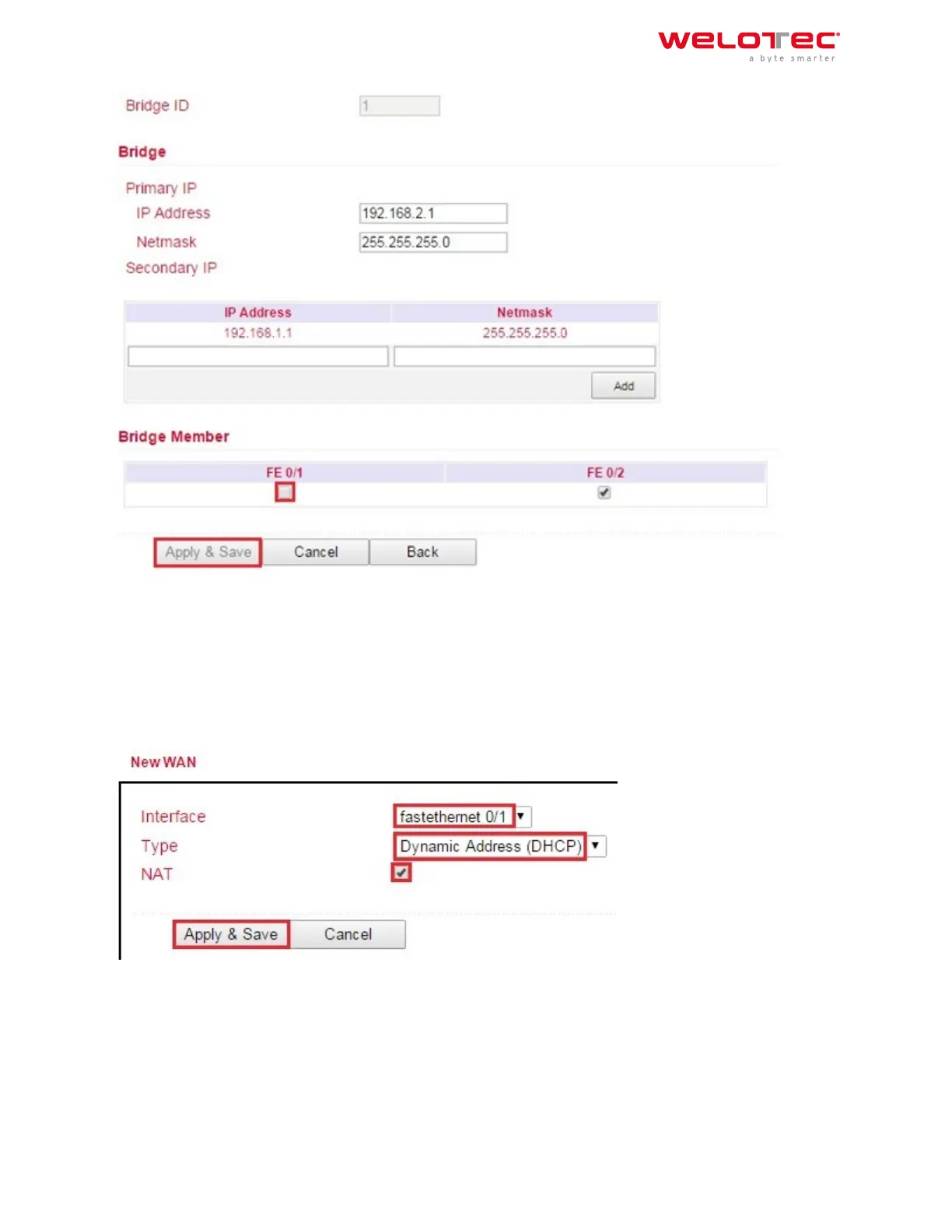 In this manual the port FE 0/1 is defined as WAN port. The New WAN Wizard is used for this purpose.