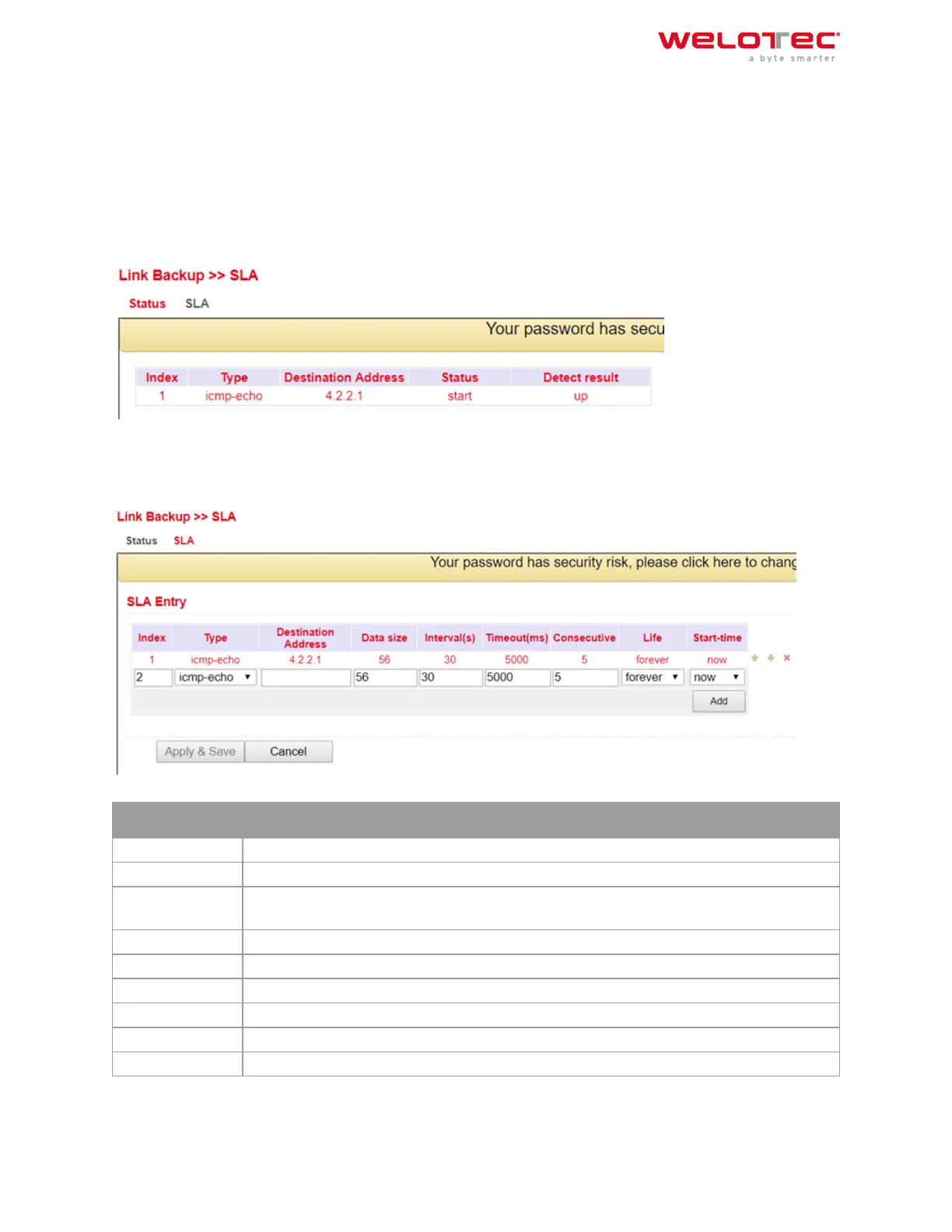 Enter the desired data under Link Backup > SLA > SLA to monitor the status of the line.