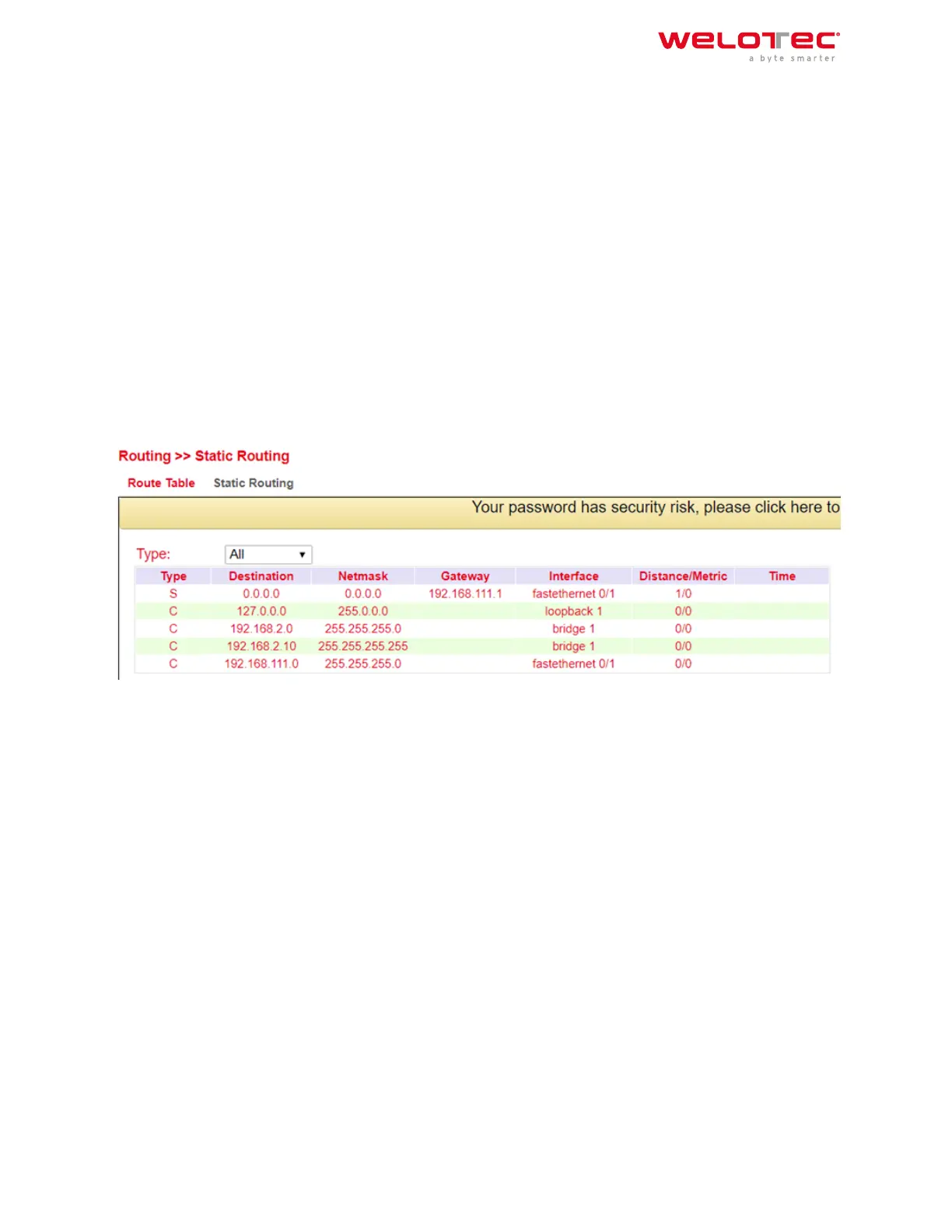 The routing table can be found in the navigation under: Routing > Static Routing > Routing Table and Routing >