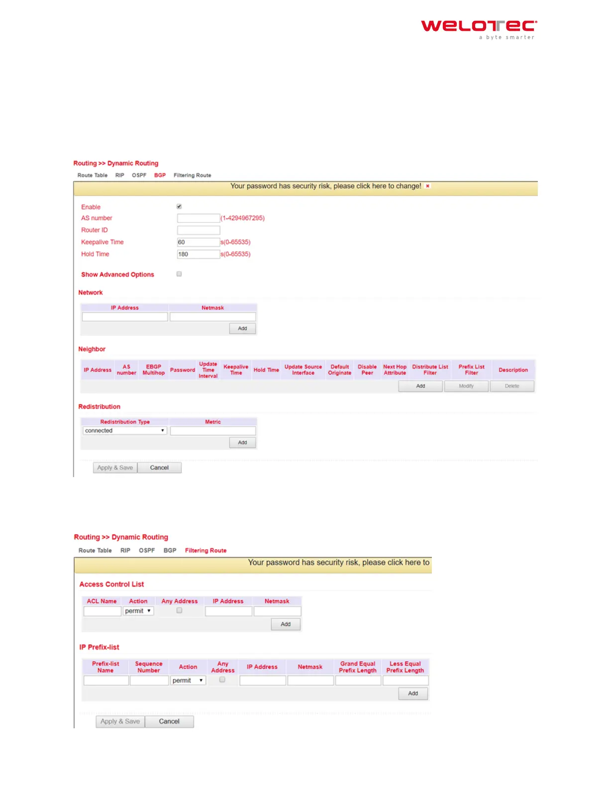 In the menu Routing > Dynamic Routing > Filtering Route you can adjust the following settings: