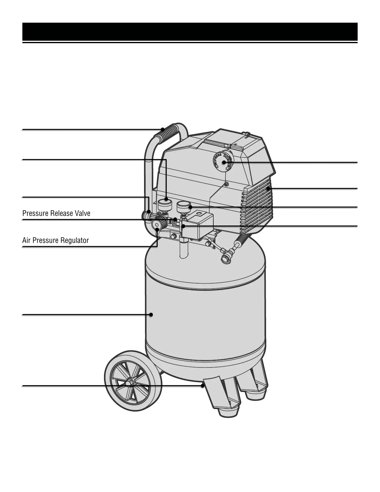become familiarized with all the parts and controls of your air compressor. The components will be referred to later