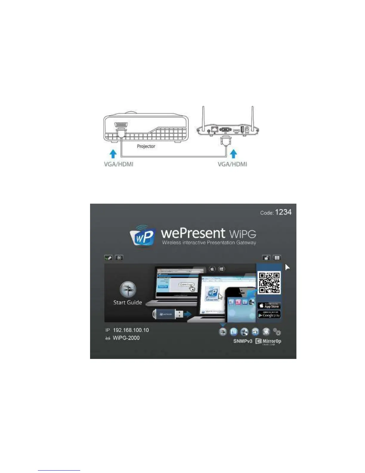 1) Connect wePresent WiPG-2000 device to Projector/display through VGA/HDMI