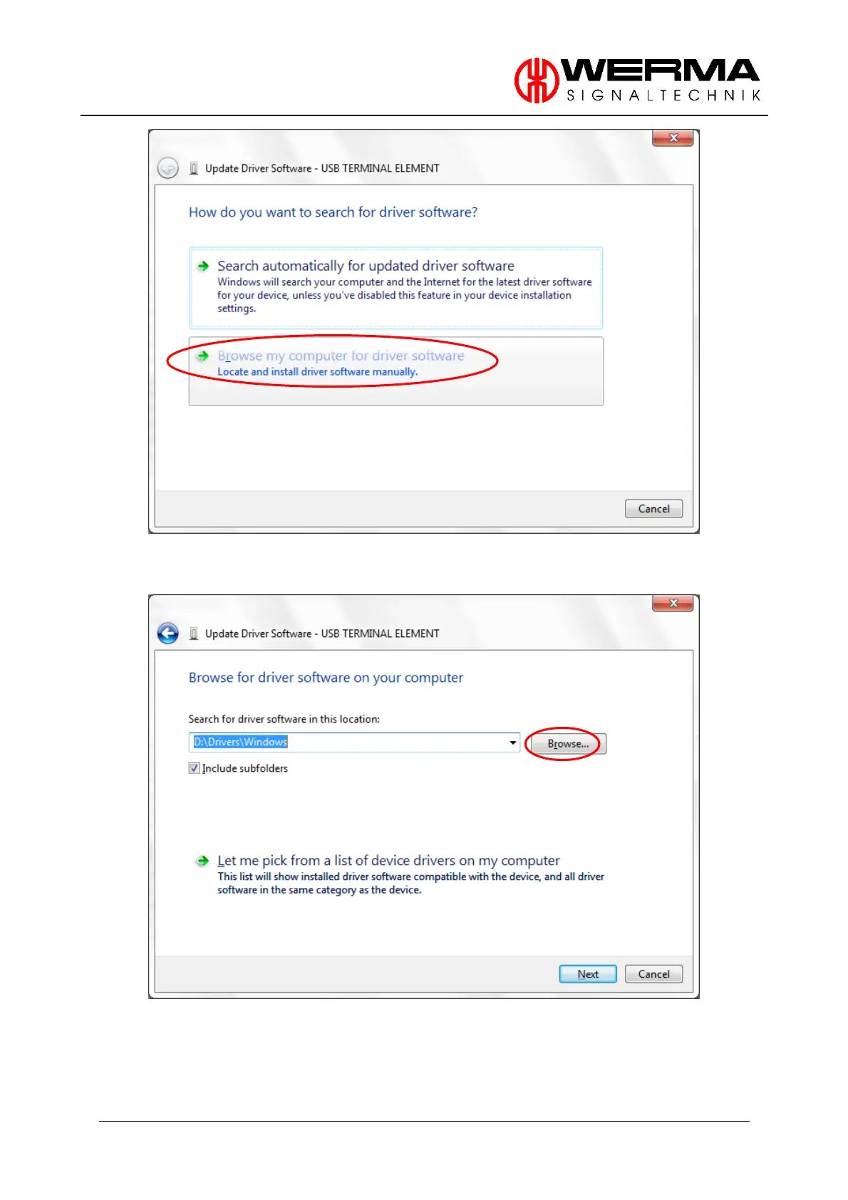 Select “Brows my computer for driver software” and insert the CD of the USB terminal element