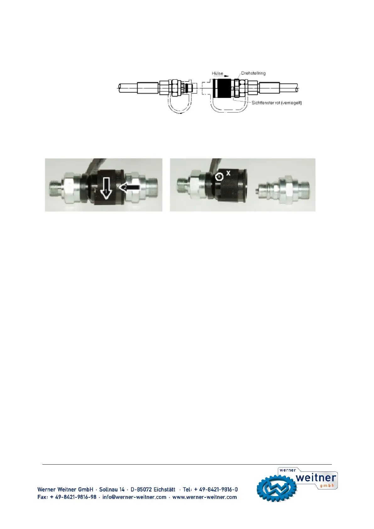 in dieser Haltung den Nippel und die Muffe zusammenstecken, die Hülse loslassen und mittels Drehstellring das Sichtfenster auf rot