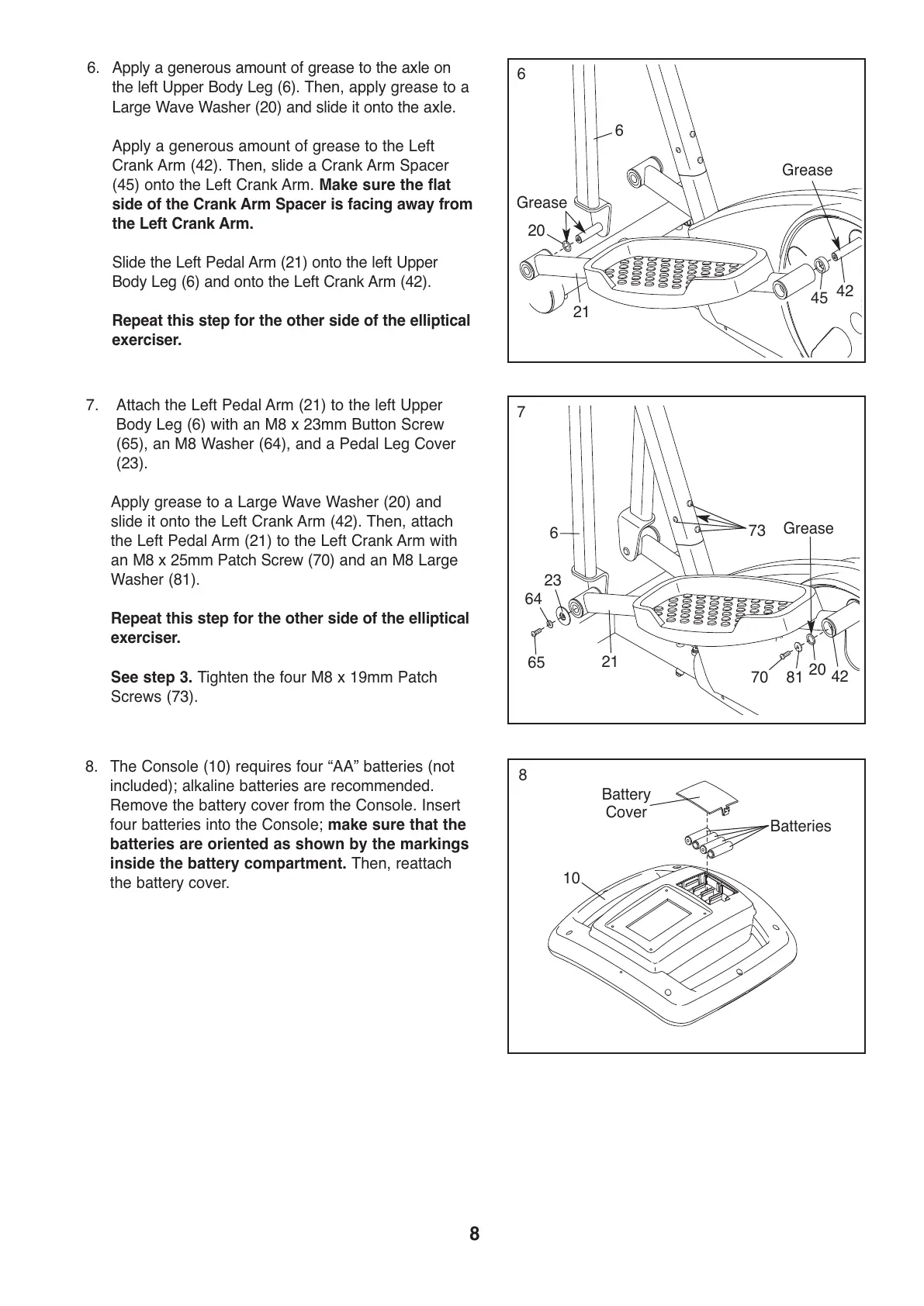 Slide the Left Pedal Arm (21) onto the left Upper