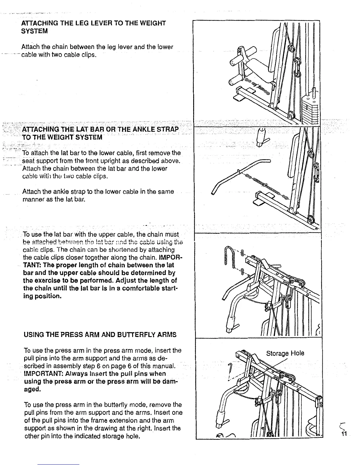Weslo Single Stack150lb B01193-b - Component Connections and Operation; Attaching the Leg Lever; Attaching the Lat Bar or Ankle Strap; Using the Press Arm and Butterfly Arms