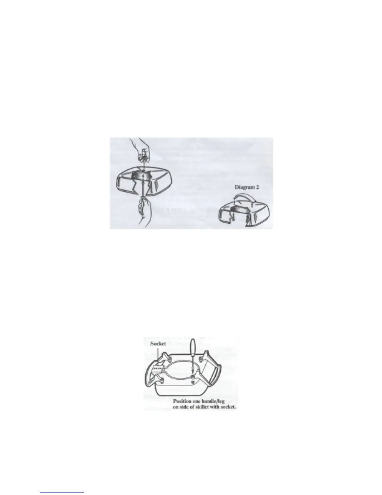 attached handle/legs. Make sure that screws are inserted straight into skillet mounting projections for proper assembly. To prevent stripping